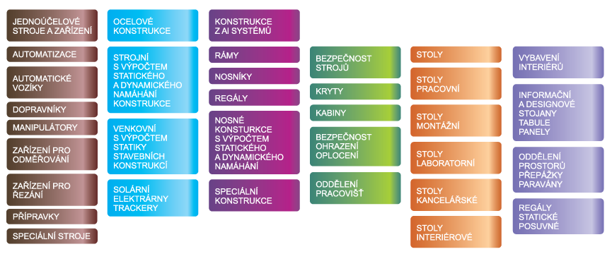 • ocelové a hliníkové konstrukce• rámy z hliníkových profilů pro stroje a zařízení• automatizace, zařízení pro automobilový průmysl• přípravky, zařízení pro zkoušky, testování apod.• bezpečnostní kryty a ohrazení strojů a pracovišť