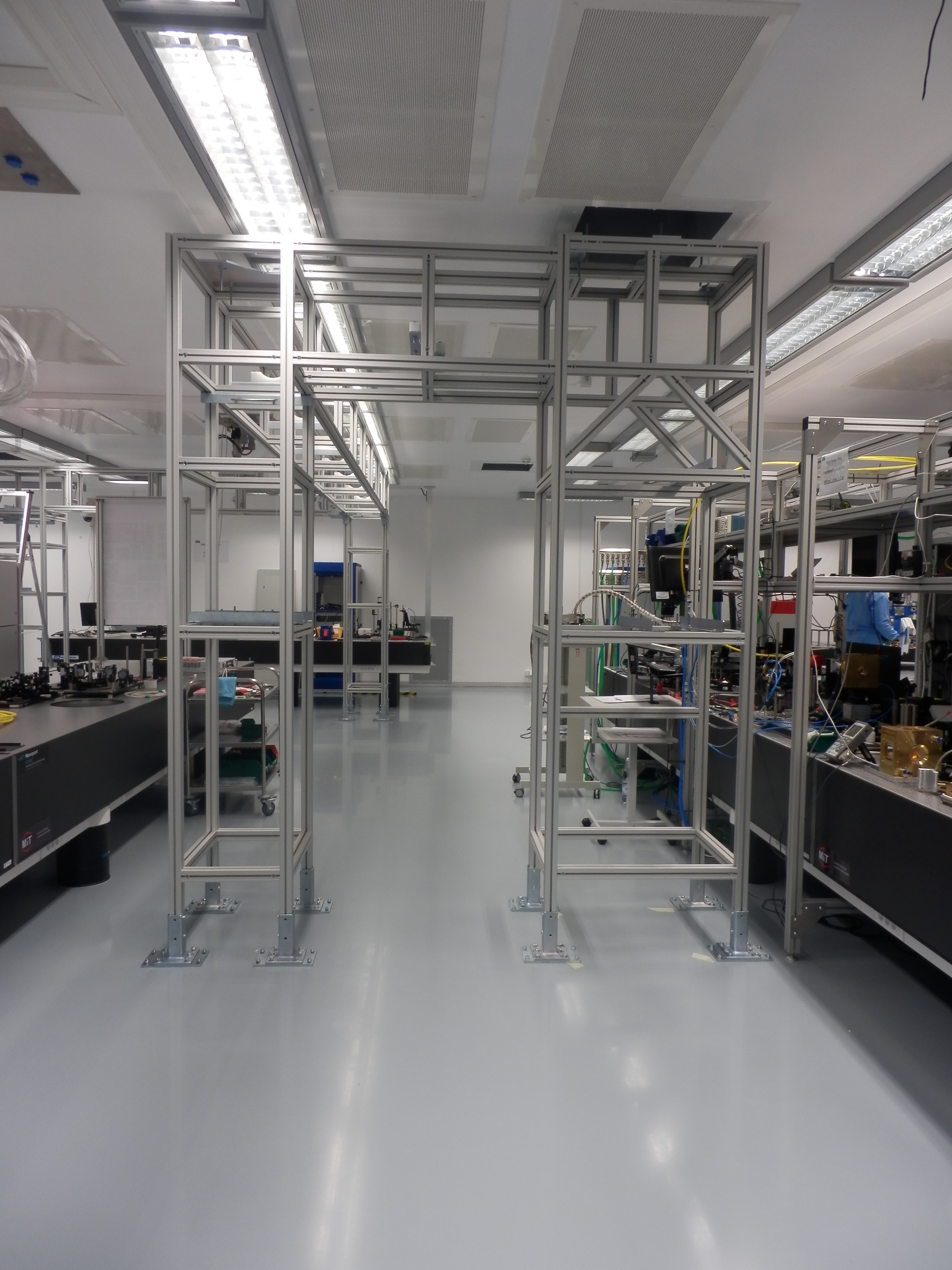 Úprava hliníkové konstrukce laserových rozvodůTato hliníková konstrukce slouží k uchycení vakuového potrubního systému pro vedení laserového paprsku. Požadavkem úpravy byla změna polohy výstupní vakuvé komory v laboratořích. Díky modulárnosti prvků hliníkové konstrukce bylo možné tuto úpravu provést ve velmi krátkém čase a jen za pomoci základního ručního nářadí bez nutnosti řezání či svařování. |