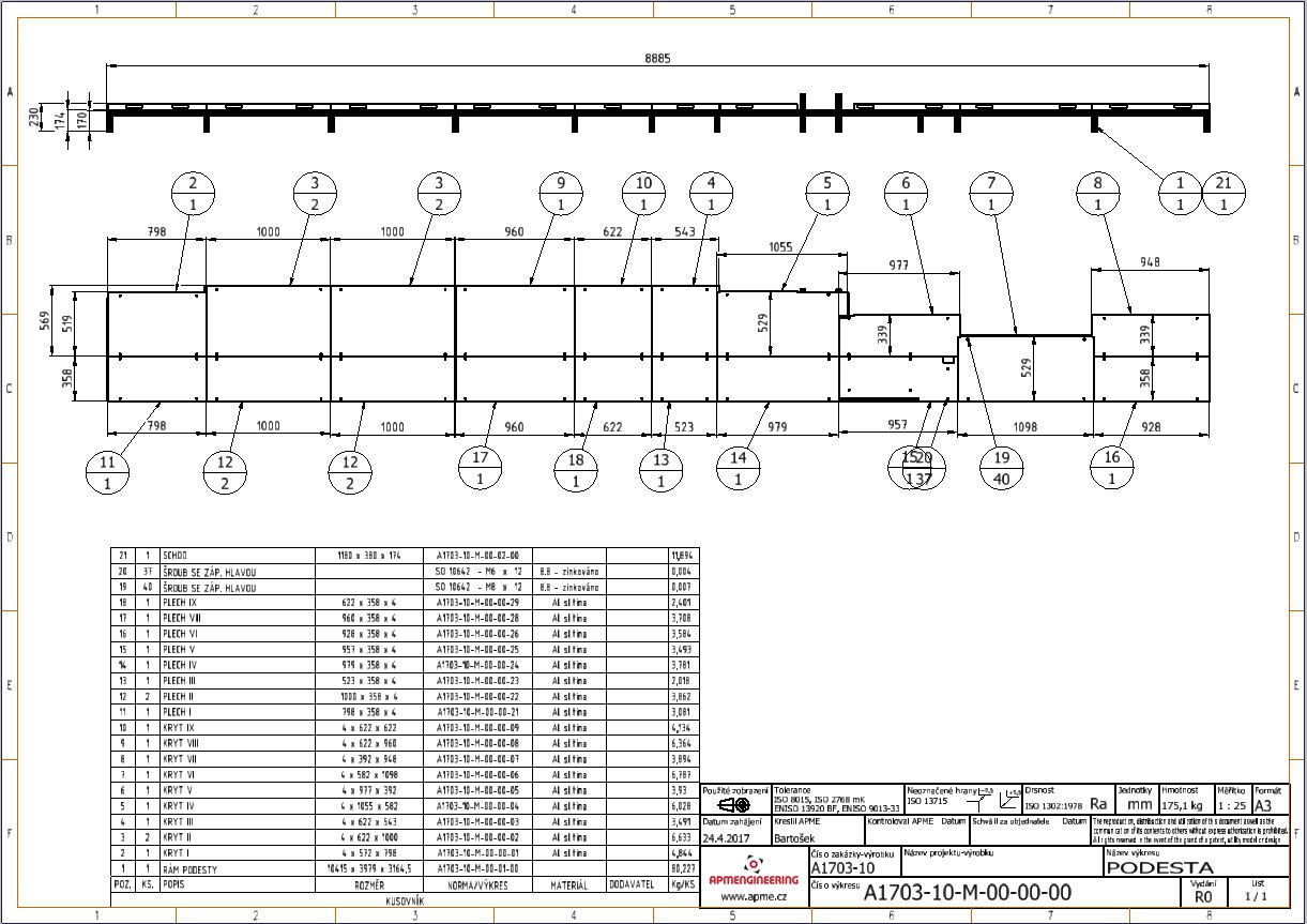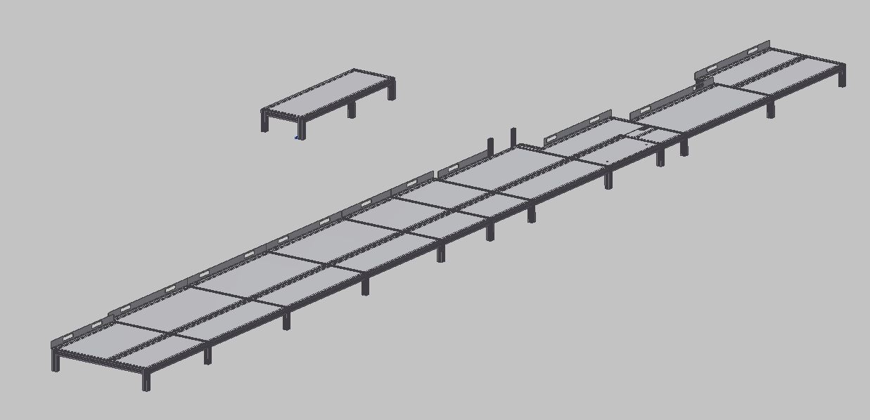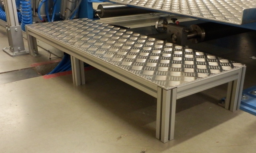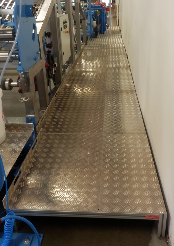 PodestaJedná se o pochůzí plošinu, která zajišťuje optimální pracovní výšku pro obsluhu výrobní linky a zároveň kryje energetické rozvody vedené v energetických kanálech po podlaze. Základní rám podesty je proveden z hliníkových profilů vzájemně spojených univerzálními ocelovými spojkami. Pochůzí plocha je tvořena pláty z hliníkových slzičkových plechů. |