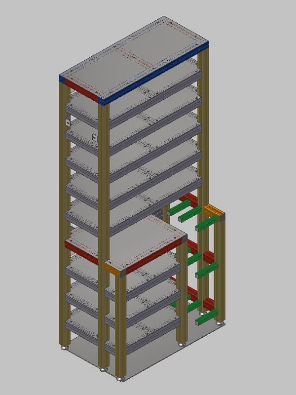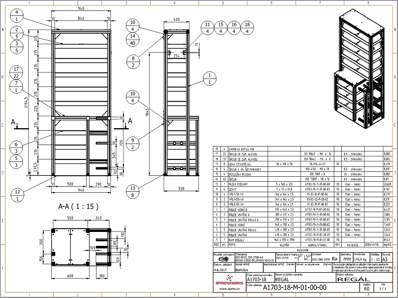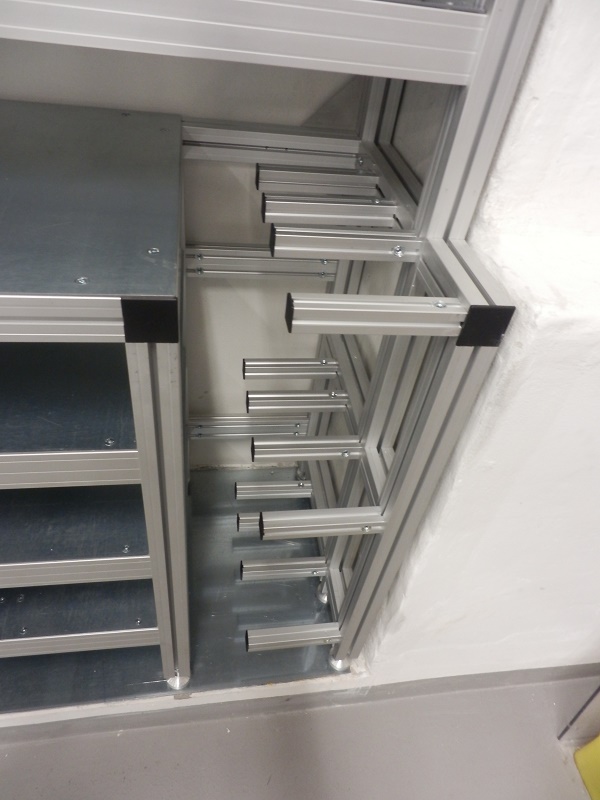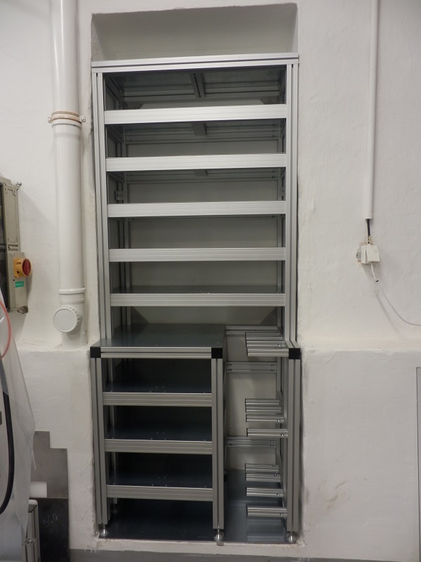 Hliníkový policový regálTento policový regál slouží k přehlednému uskladnění materiálu. Doporučená nosnost jednotlivých polic je stanovena na 250kg a celková nosnost regálu pak může dosahovat 2500kg. Regál je umístěn ve stávajícím výklenku ve stěně, který vznikl po zazdění dveří. Konstrukce regálu je navržena z hliníkových profilů velikosti 50x50 a 60x30mm. Pro zvýšení tuhosti jsou navíc některé rohové spoje vystuženy plochými nerezovými výztuhami typu VPL. Výplně police jsou vyrobeny z ocelového zinkovaného plechu. Pro přesné usazení na místě jsou sloupy regálu vybaveny stavitelnými nohami 50-M16-St/St. |