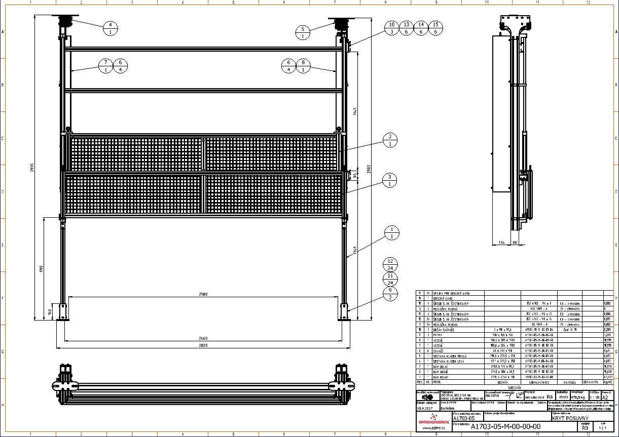 Kryt posuvnýTato navržená ochranná konstrukce k zamezení dosahu k nebezpečným místům představuje již třetí generaci těchto zábran. Základem krytu je pevný hliníkový rám ukotvený v podlaze a stropu haly. Na tomto rámu jsou uchyceny ocelové vodící tyče a protizávaží posuvných krytů. Posuvné kryty jsou navrženy také z hliníkových profilů a výplně jsou z ocelového zinkovaného pletiva. Dle požadavku může být výplň provedxena i z jiného materiálu (polykarbonát, ocelový nebo hliníkový plech a pod.). Posuvné rámy lze snadno přesouvat mezi horní a dolní polohou. Horní poloha krytu zajišťuje snadný přístup obsluhy k zařízení. Dolní poloha krytu brání přístupu obsluze k zařízení při jeho provozu. Obě polohy posuvných krytů jsou indikovány snímači koncových poloh. V případě že nastane odsunutí krytu z pracovní polohy dojde k zastavení zařízení. |