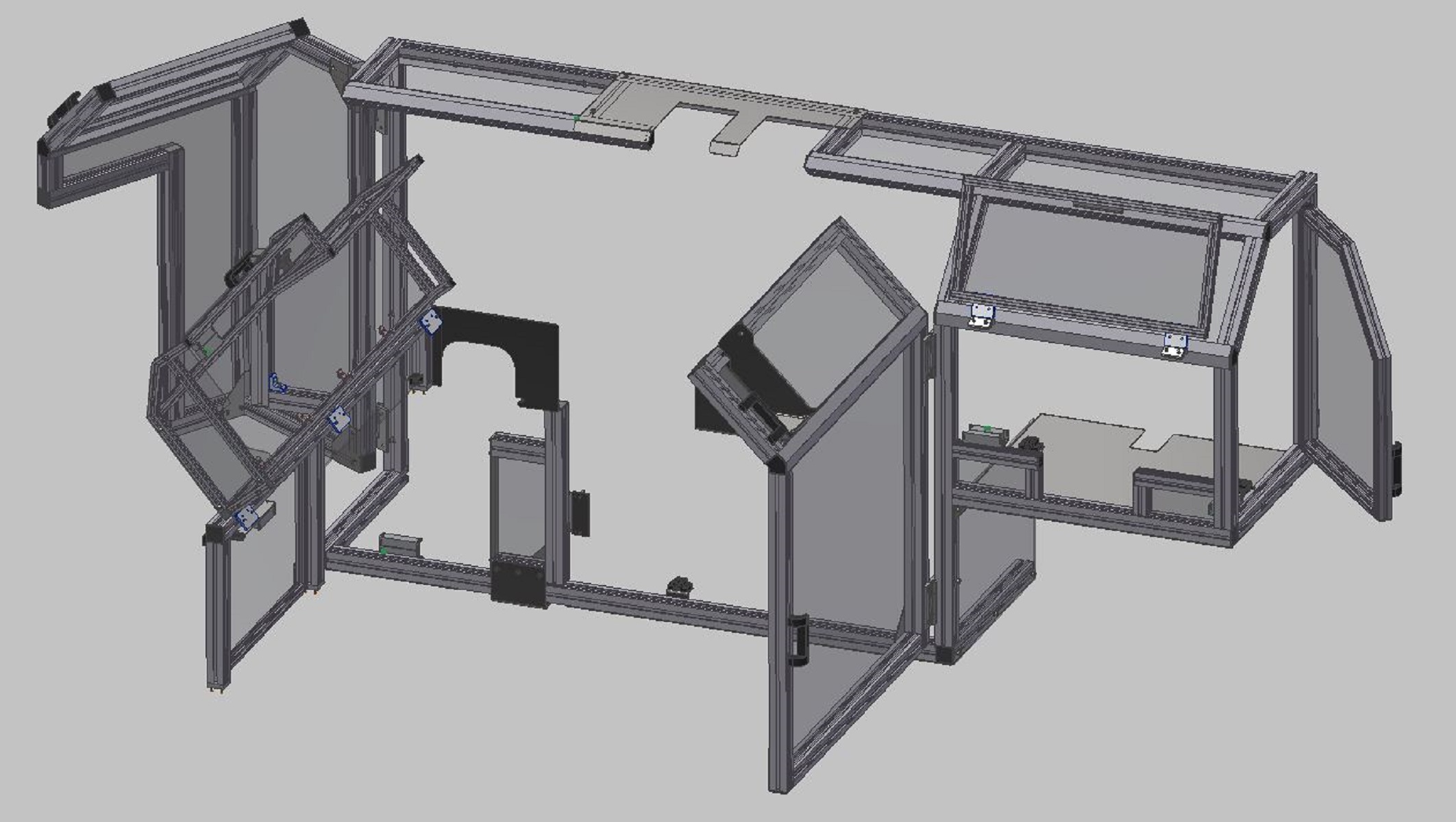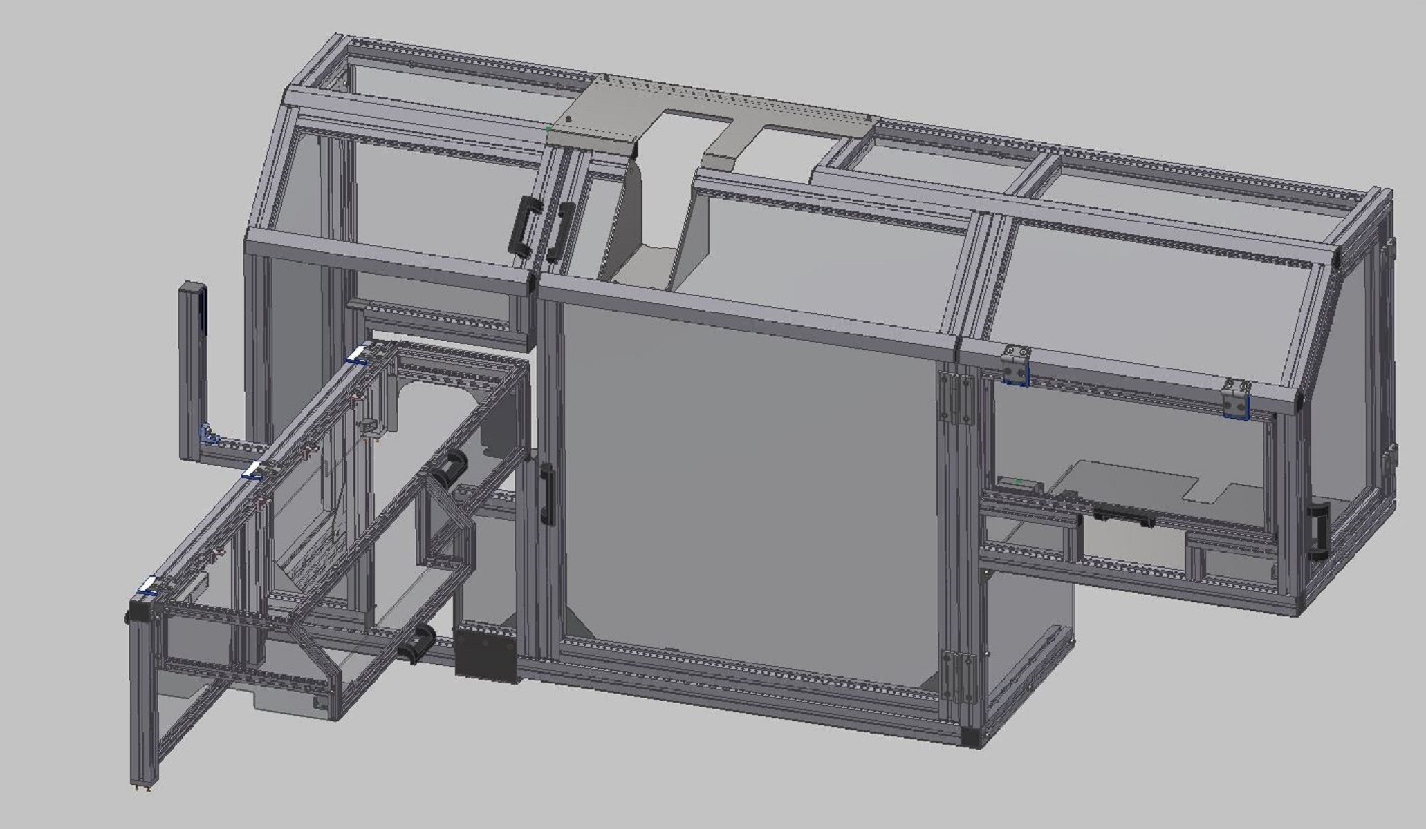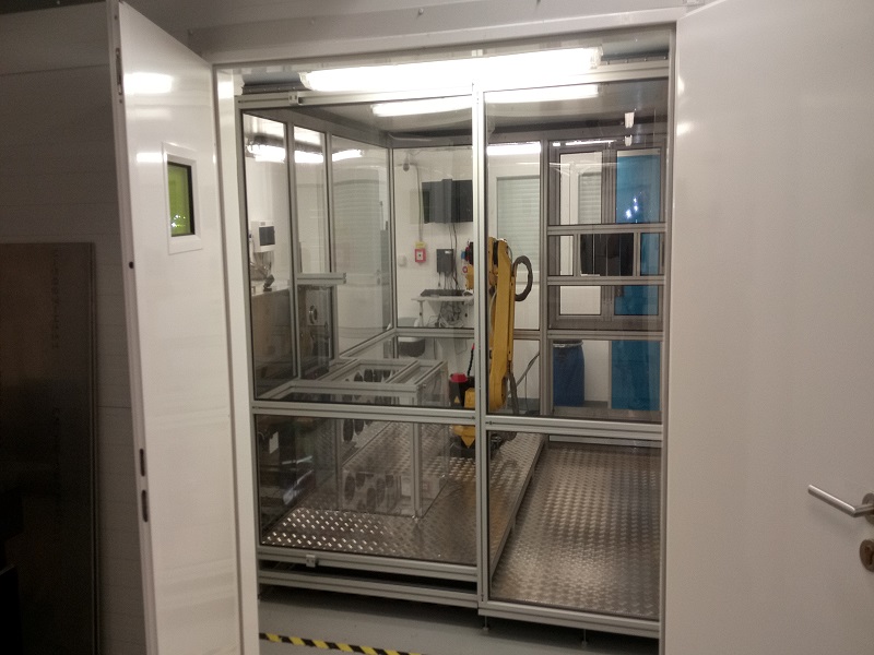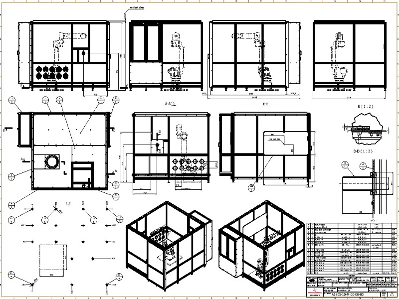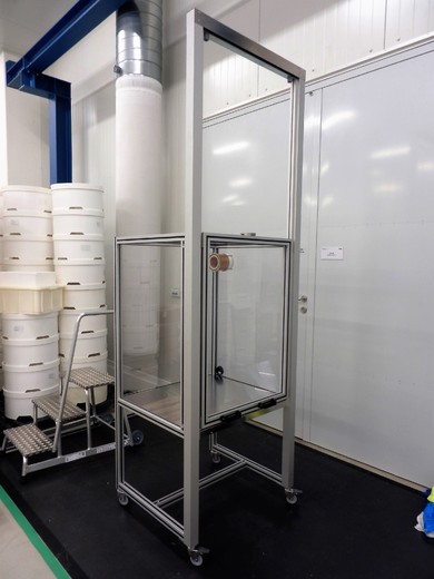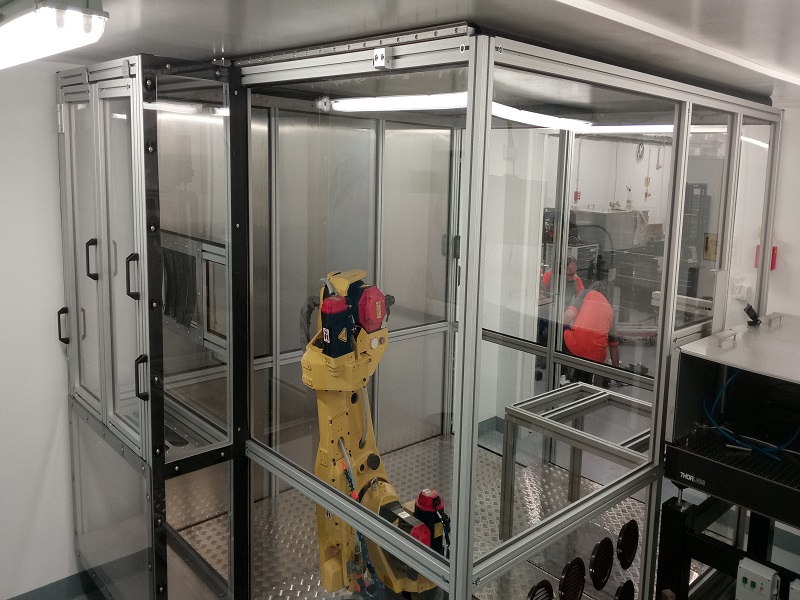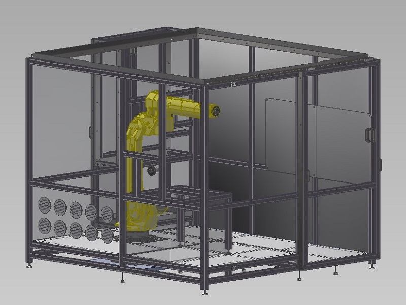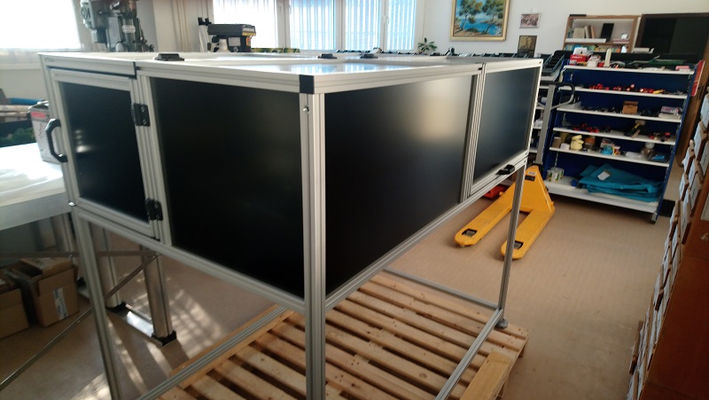 Kabina z AL profilůKabina slouží jako ochranný kryt v laboratoři pro výzkum aplikací laseru. Kabina je navržena z hliníkových profilů rozměrové řady 50mm s výplněmi z polykarbonátu a aloxovaného plechu. Podlaha kabiny je z hliníkového pochůzího plechu. Ve vnitřním prostoru je instalován manipulátor a hliníkový rám s úkapovou polykarbonátovou jímkou. Vstup do kabiny zajišťují posuvné dveře a na protilehlé straně posuvný box s dvoukřídlým oknem které slouží k vyjímání testovaných dílů. |