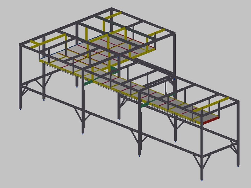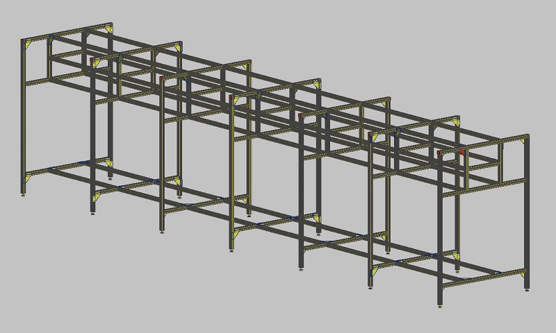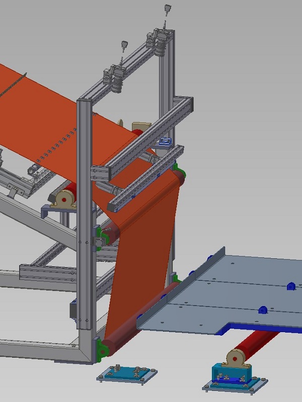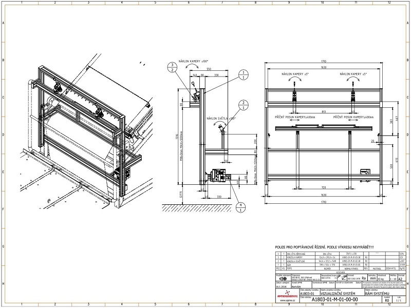 Rám kamerRám je navržen jako nosná kontrukce pro uchycení snímacích kamer a osvětlovacího systému. Celek slouží ke kontrole povrchu zpracovávaného materiálu na výrobní lince. Pro tento rám byly použity hliníkové profily velikosti 40x80mm a 40x40mm, které zajišťují dostatečnou tuhost konstrukce a stabilní polohu instalovaného zařízení. |