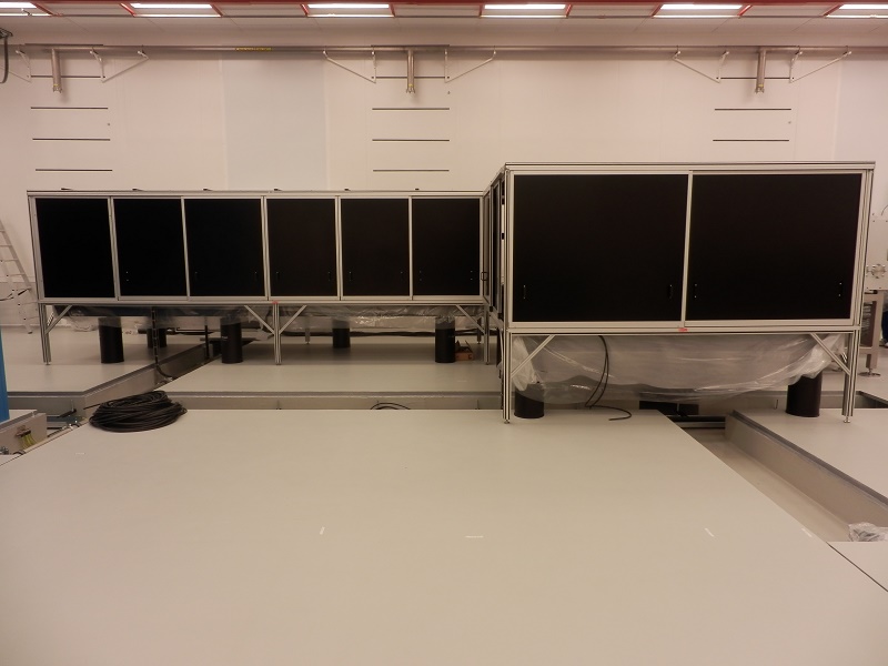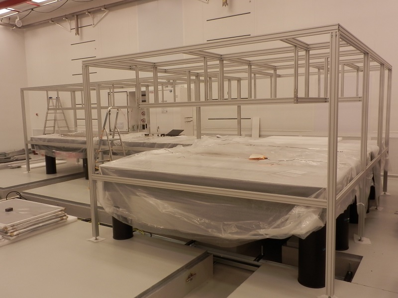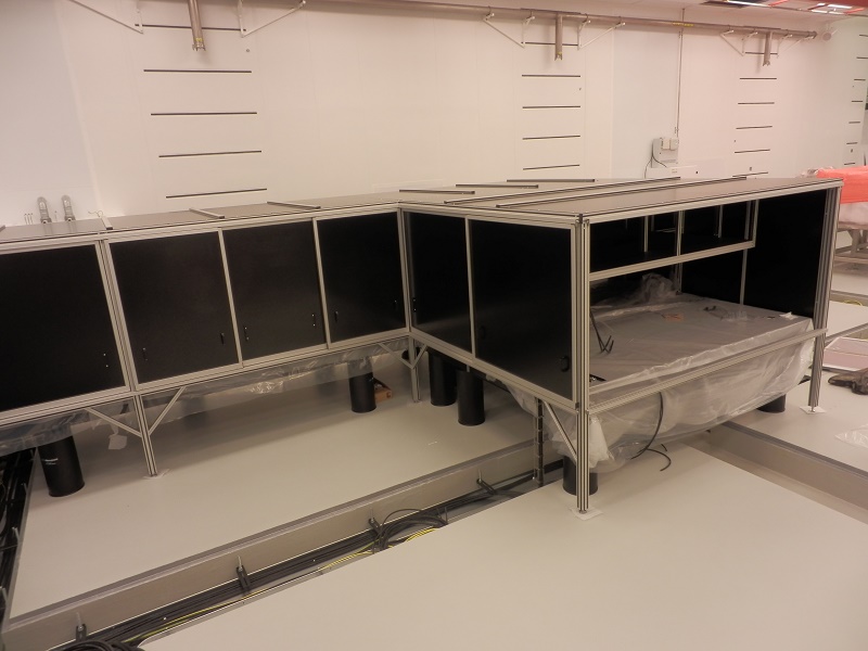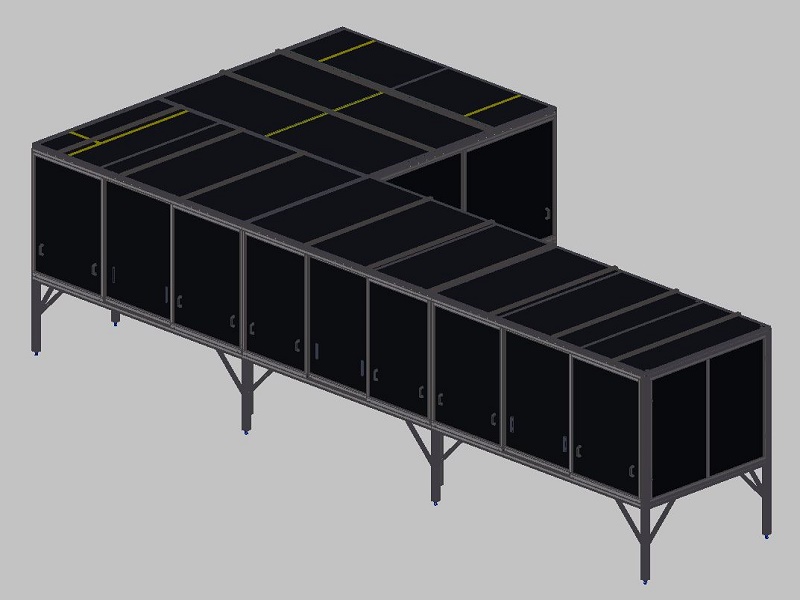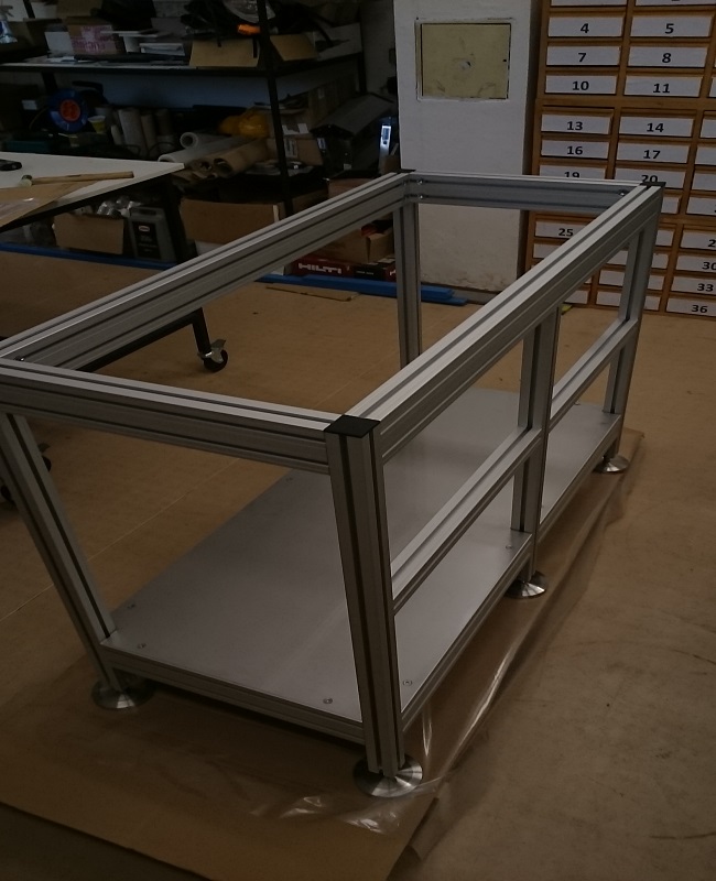 Rám s krytemRám je určen jako nosná kontrukce nad optickými stoly. Základní kostra rámu je navržena z hliníkových profilů řady 30mm. Sloupy a konstrukce jsou z profilů velikosti 60x60mm. Ostatní příčky jsou z profilů velikosti 30x60 a 30x30mm. Na rámu jsou ve střední části uchyceny police z jednostranně lakovaného nerezového plechu s doporučenou maximální nosností 50kg/m2. Tyto police slouží k umístění laboratorní techniky a dalšího potřebného příslušenství. Po obvodu stolu jsou boční stěny rámu opatřeny posuvnými ochrynnými kryty s černě lakovanými výplněni z hliníhového plechu. Horní plocha nad stoly je také kompletně kryta černě lakovaným hliníkovým plechem. Pro přesné vystavení celého ochranného rámu jsou sloupy opatřeny stavitelnými nožičkami 50/M14-Al/St. |