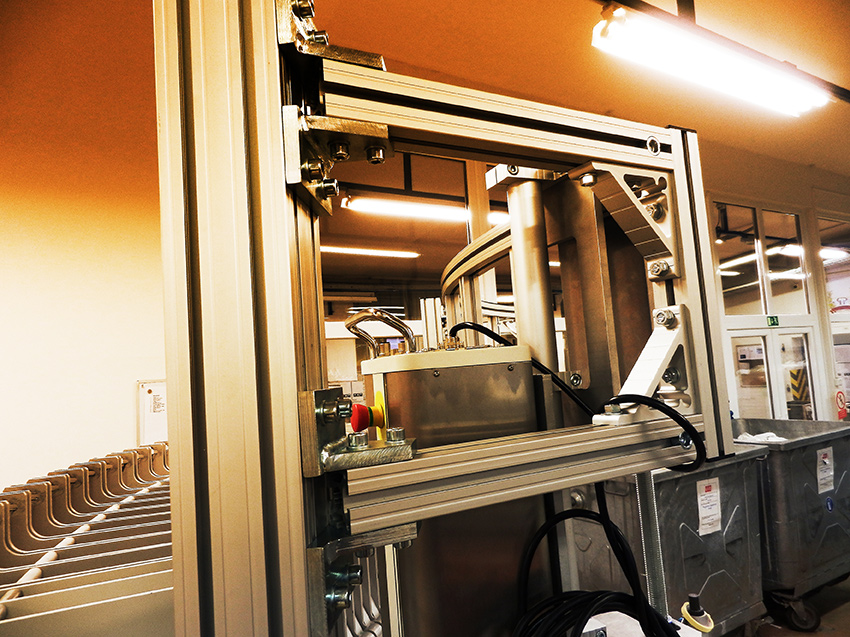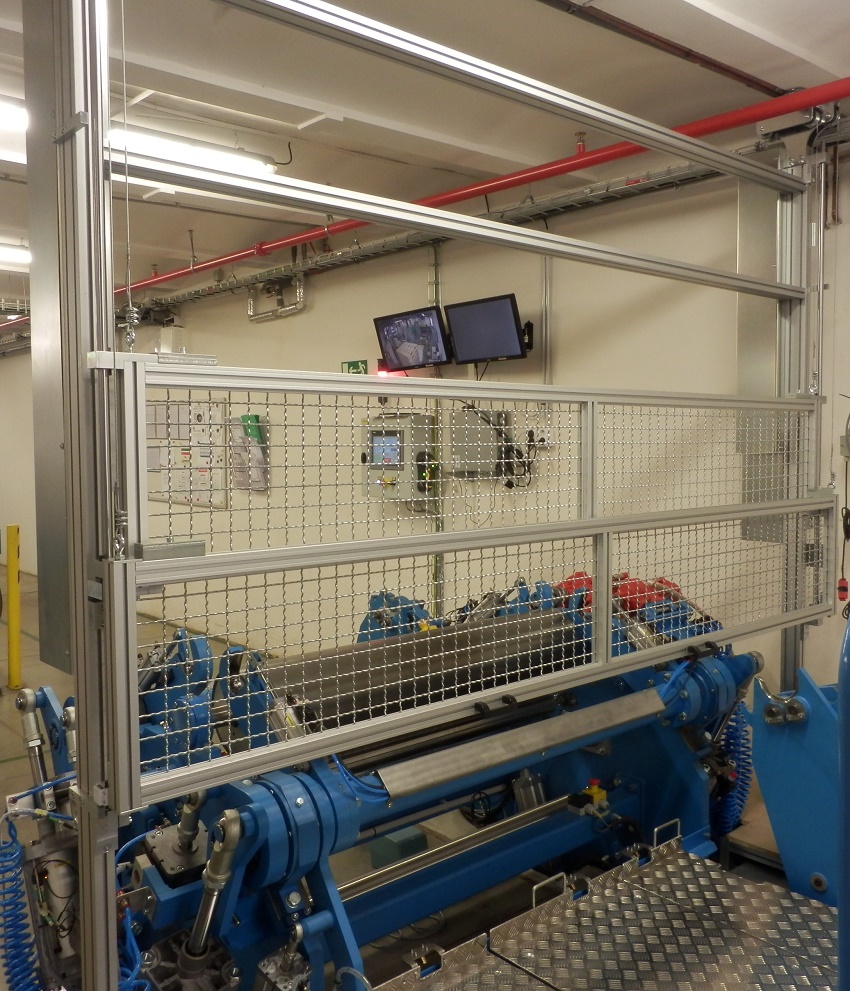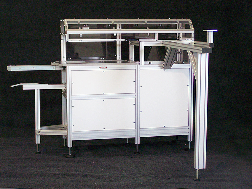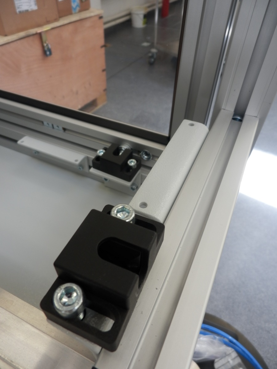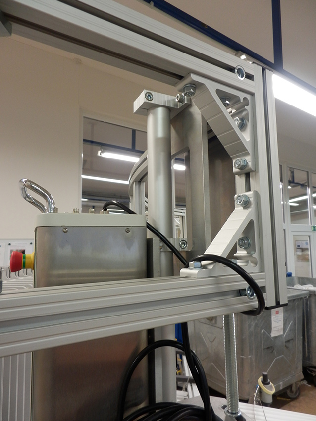 Kryt strojeJedná se o kryt z hliníkových profilů rozměrové řady 40 a 20 s výplněni z polykarbonátu. Tento kryt slouží jako ochranná konstrukce k zamezení dosahu k nebezpečným místům při provozu stroje. Prvořadým požadavkem na tento kryt, kromě bezpečnosti, byla i jednoduchá a maximálně možná přístupnost k zařízení při údržbě a seřizování. Proto je kryt sestaven ze sedmi samostatně se odklápějících částí Uzavřená poloha je indikována bezpečnostními snímači s a zajištěna kulovými západkami. K zajištění vysoké tuhosti jsou nejexponovanější spoje vyztuženy rohovými výztuhami z ocelového nerezového plechu. |