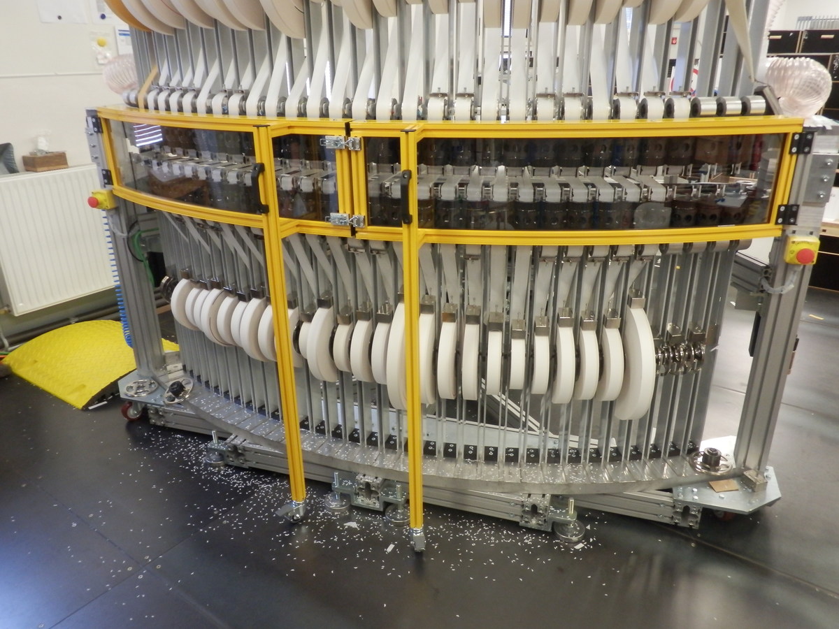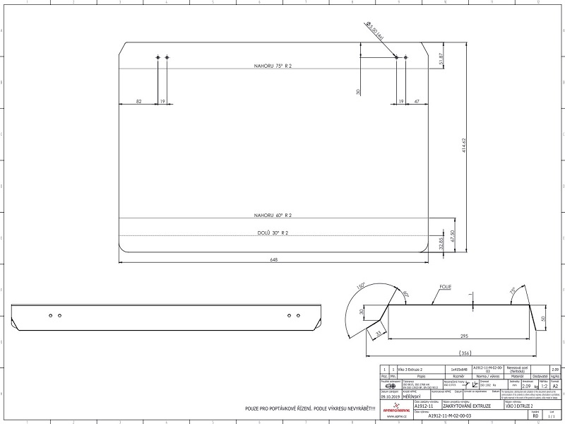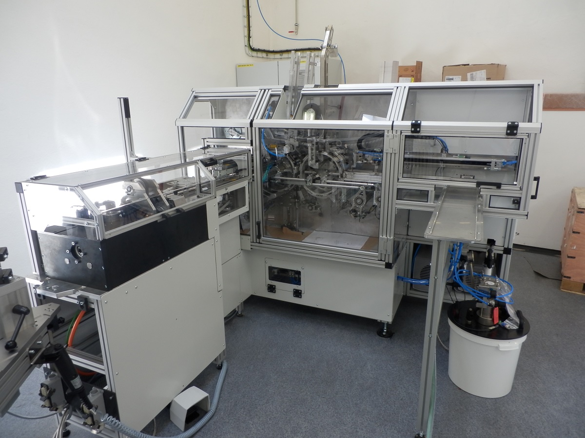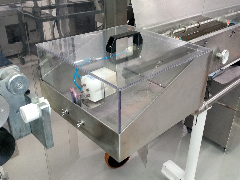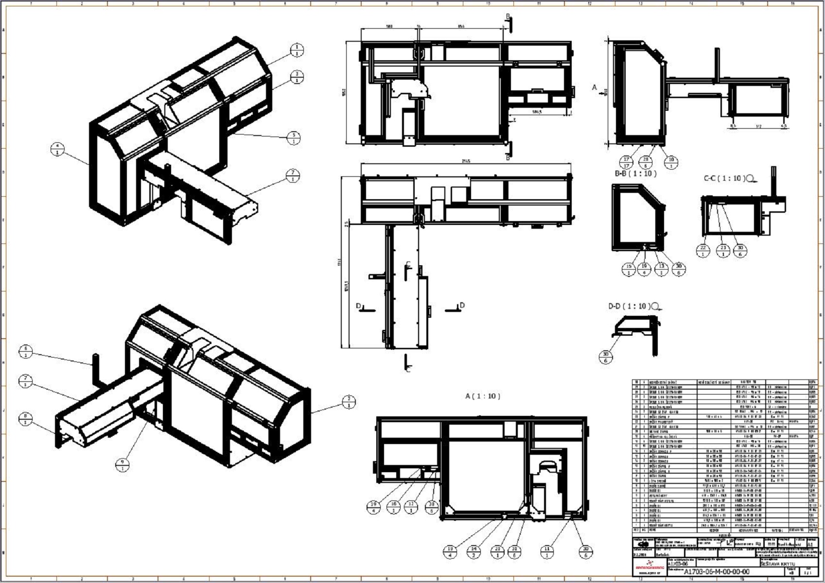 Kryt strojeJedná se o kryt z hliníkových profilů rozměrové řady 40 a 20 s výplněni z polykarbonátu. Tento kryt slouží jako ochranná konstrukce k zamezení dosahu k nebezpečným místům při provozu stroje. Prvořadým požadavkem na tento kryt, kromě bezpečnosti, byla i jednoduchá a maximálně možná přístupnost k zařízení při údržbě a seřizování. Proto je kryt sestaven ze sedmi samostatně se odklápějících částí Uzavřená poloha je indikována bezpečnostními snímači s a zajištěna kulovými západkami. K zajištění vysoké tuhosti jsou nejexponovanější spoje vyztuženy rohovými výztuhami z ocelového nerezového plechu. |