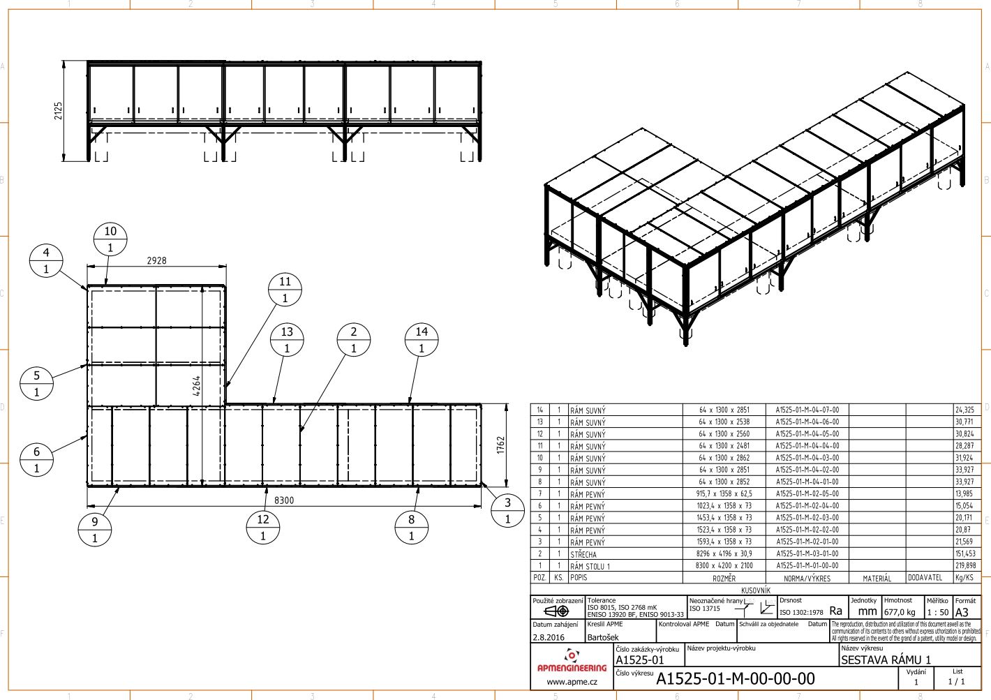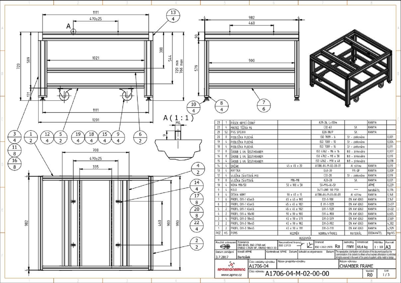 Rám vakuové komoryTento rám byl navržen pro instalaci a případný převoz vakuové komory v hygienicky čistých prostorech výzkumných laboratoří. Celková nosnost rámu je více jak 500kg. Rám je navržen z hliníkových profilů 45x45mm, 45x90mm a 90x90mm. Na horních profilech jsou úhelníky pro uchycení vakuové komory. Rám je osazen pojezdovými koly s nosností 4x190kg, které zajišťují snadný přesun. Pro stabilní ustavení na místě je rám také vybaven stavitelnými nohami 50/M16-Al/St. |