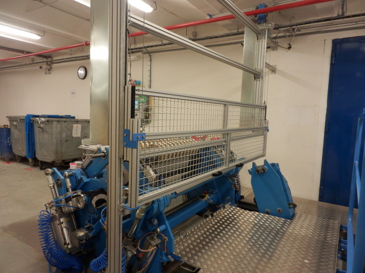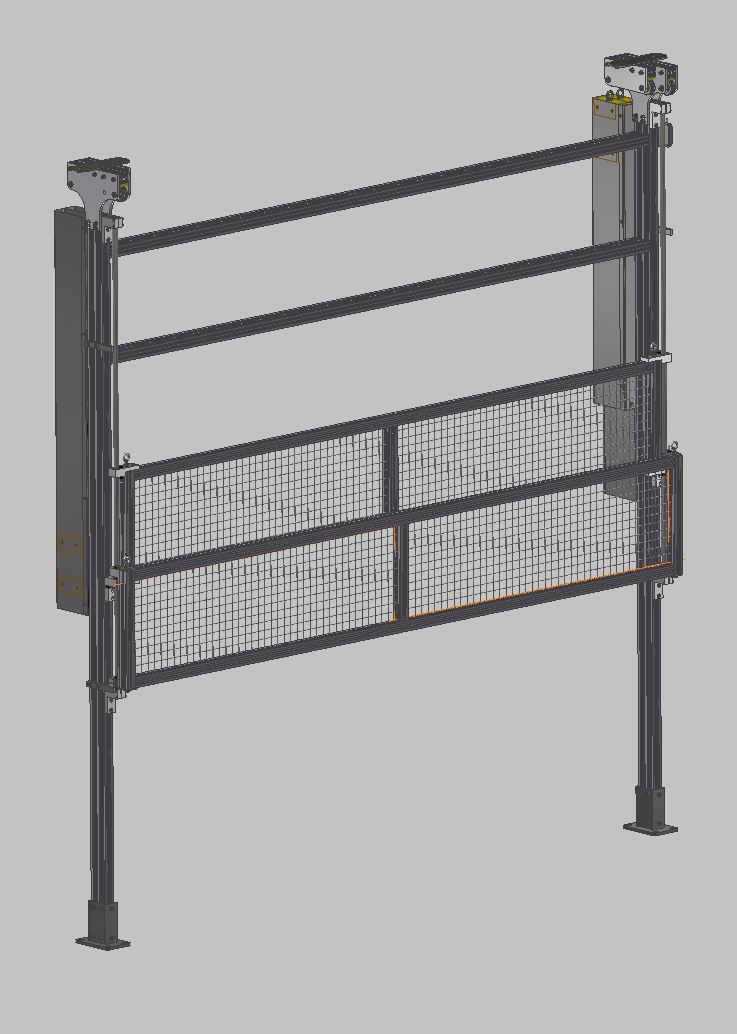 Kryt posuvnýTato navržená ochranná konstrukce k zamezení dosahu k nebezpečným místům představuje již třetí generaci těchto zábran. Základem krytu je pevný hliníkový rám ukotvený v podlaze a stropu haly. Na tomto rámu jsou uchyceny ocelové vodící tyče a protizávaží posuvných krytů. Posuvné kryty jsou navrženy také z hliníkových profilů a výplně jsou z ocelového zinkovaného pletiva. Dle požadavku může být výplň provedxena i z jiného materiálu (polykarbonát, ocelový nebo hliníkový plech a pod.). Posuvné rámy lze snadno přesouvat mezi horní a dolní polohou. Horní poloha krytu zajišťuje snadný přístup obsluhy k zařízení. Dolní poloha krytu brání přístupu obsluze k zařízení při jeho provozu. Obě polohy posuvných krytů jsou indikovány snímači koncových poloh. V případě že nastane odsunutí krytu z pracovní polohy dojde k zastavení zařízení. |
