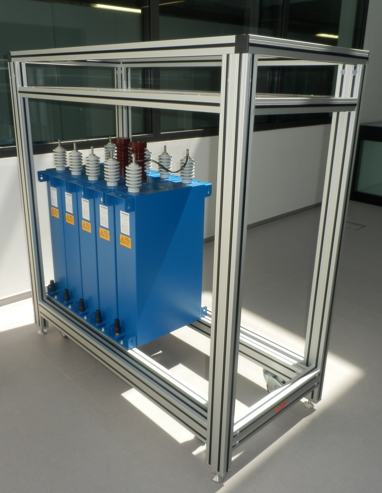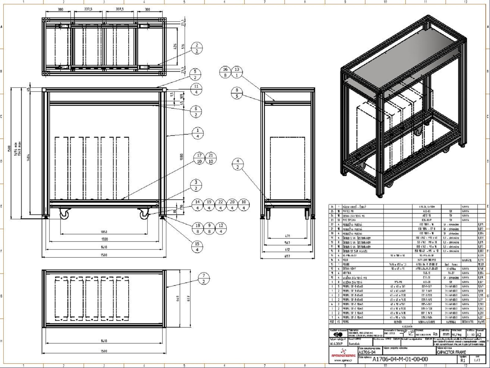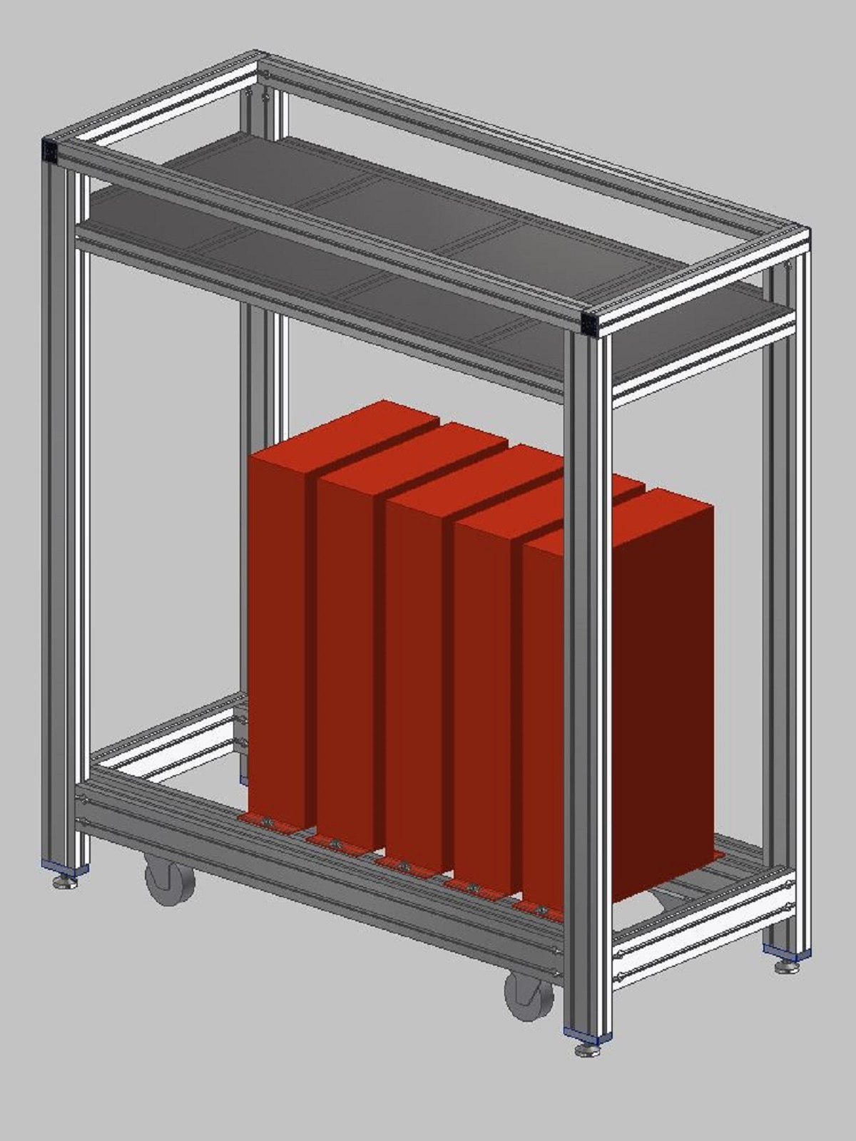 Rám kondenzátoruTento rám byl navržen pro instalaci a případný převoz vysokokapacitních kondenzátorů s příslušenstvím v hygienicky čistých prostorech výzkumných laboratoří. Celková nosnost rámu je více jak 500kg. Rám je navržen z hliníkových profilů 45x45mm a 45x90mm. Ve spodní části je prostor pro uchycení kondenzátorů a v horní části je police s deskou z nerezového kartáčovaného plechu. Rám je osazen pojezdovými koly s nosností 4x190kg, které zajišťují snadný přesun. Pro stabilní ustavení na místě je rám také vybaven stavitelnými nohami 50/M16-Al/St. |