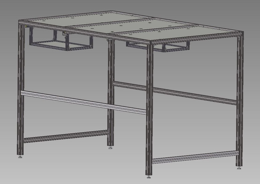 Rám optického stolu s policemiTento rám je určen do výzkumných laboratoří. Konstrukce rámu je navržena z profilů rozměrové řady 30. Základní spodní rám je z profilu 60x30mm a nohy jsou z profilu 60x60mm. Jsou použity profily základní, drážkované. Profily jsou spojeny pomocí speciálních systémových PVS spojek zajišťujících elektricky vodivé propojení profilů a konce profilů jsou opatřeny černými krytkami PA-GF. Rám je postaven na výškově stavitelných nohách 50/M16-Al/St. Horní strana rámu je kryta nerezovým plechem tl. 1.5mm, který je uchycen na hliníkové eloxované L profily. Tento plech slouží jako police a je určen pro uložení laboratorních přístrojů. Kruhové otvory v plechu jsou určeny k přívodu energií do prostoru stolu. Na horních nosnících jsou také instalovány nerezová vedení ve kterých jsou zavěšeny dvě posuvné police. Tyto police jsou určené také pro laboratorní přístroje. Pojice jsou osazeny ocelovými pojezdovými kolečky s valivými ložisky a plastovými běhouny. Toto provedení zajišťuje hladký a tichý chod. Každá police je také vybavena ručním aretačním kolečkem, díky kterému lze polici zajistit v požadované poloze. |