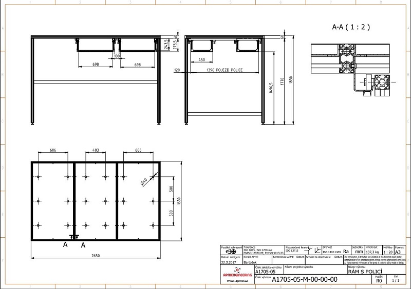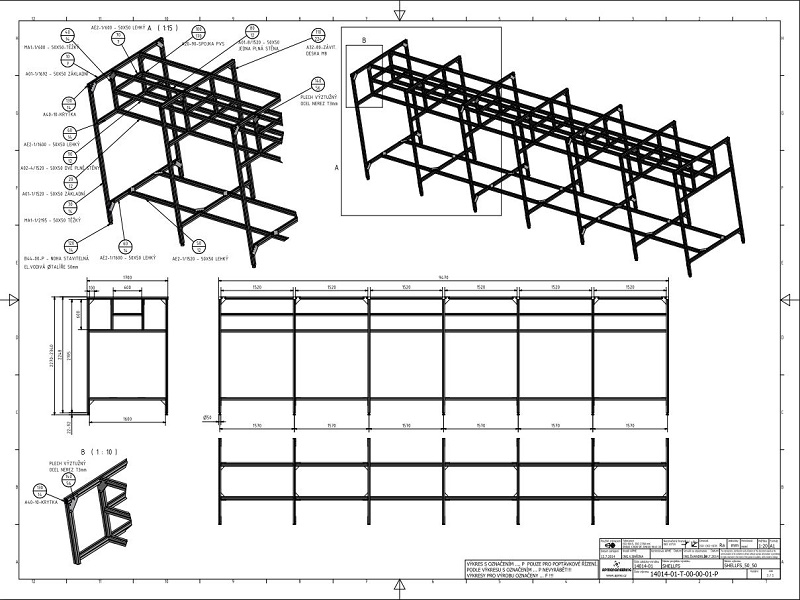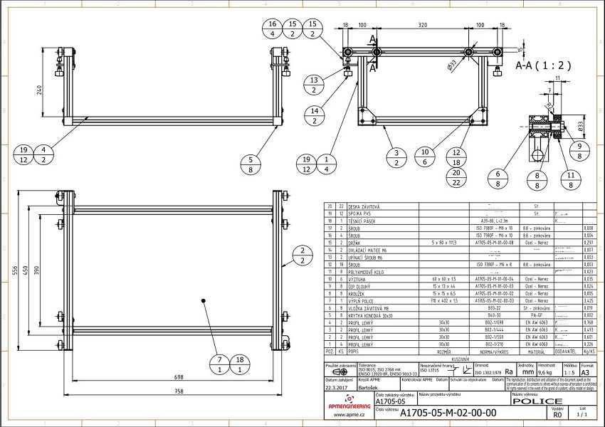 Rám s policemiTento rám je určen do výzkumných laboratoří. Konstrukce rámu je navržena z profilů rozměrové řady 50. Jsou použity profily základní, drážkované a mezi sebou jsou spojeny pomocí speciálních systémových PVS spojek zajišťujících elektricky vodivé propojení profilů. S ohledem na tuhost rámu jsou některé spoje vyztuženy rohovými nerezovými výztuhami VPLF-50-VA. Konce profilů jsou opatřeny černými krytkami PA-GF. Rám je postaven na výškově stavitelných celohliníkových nohách 50/M16-Al/Al. |