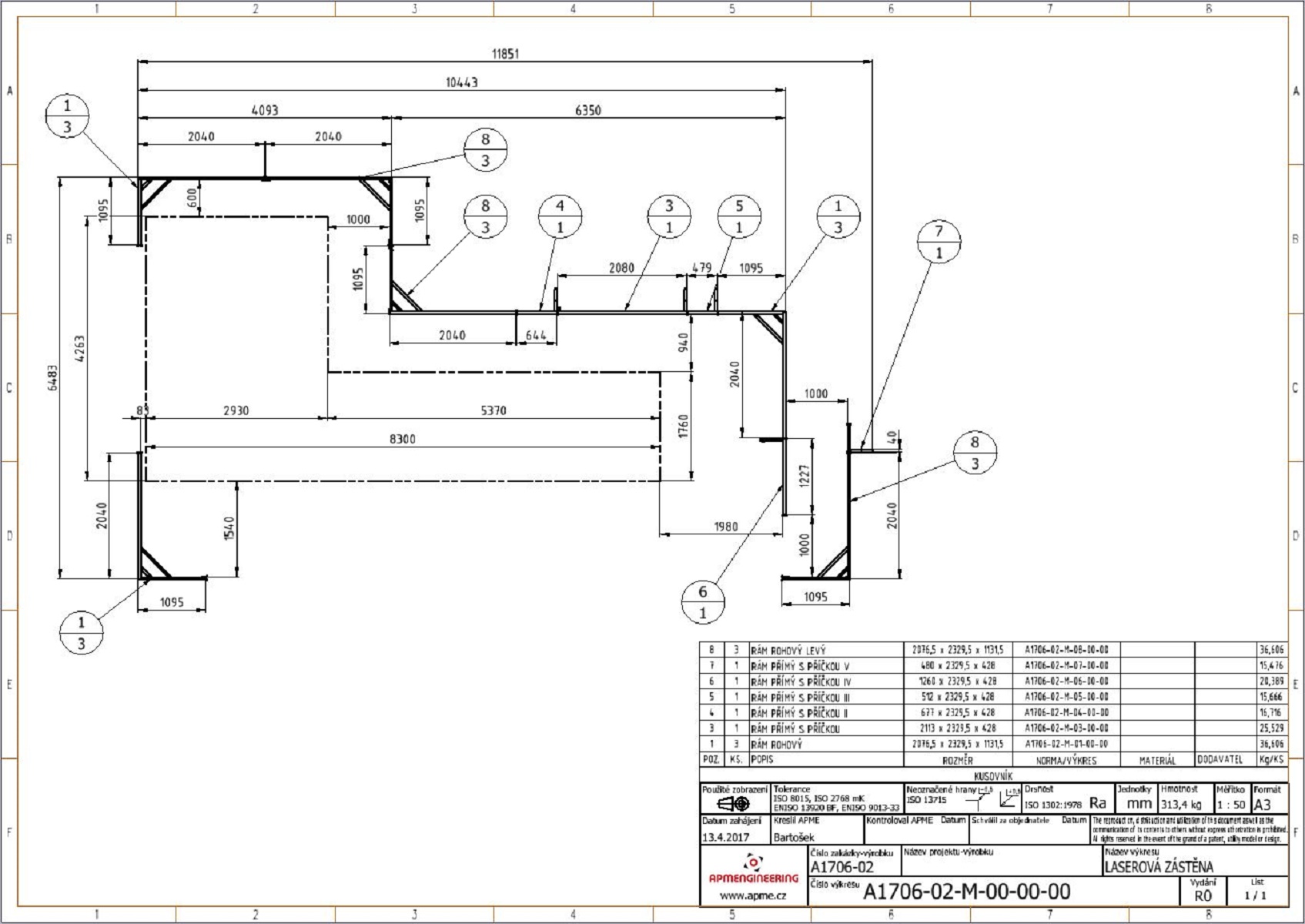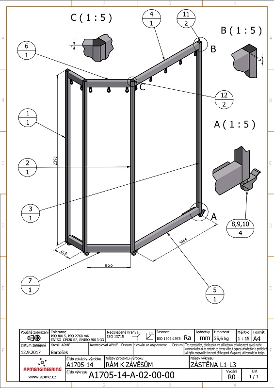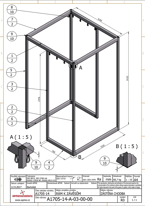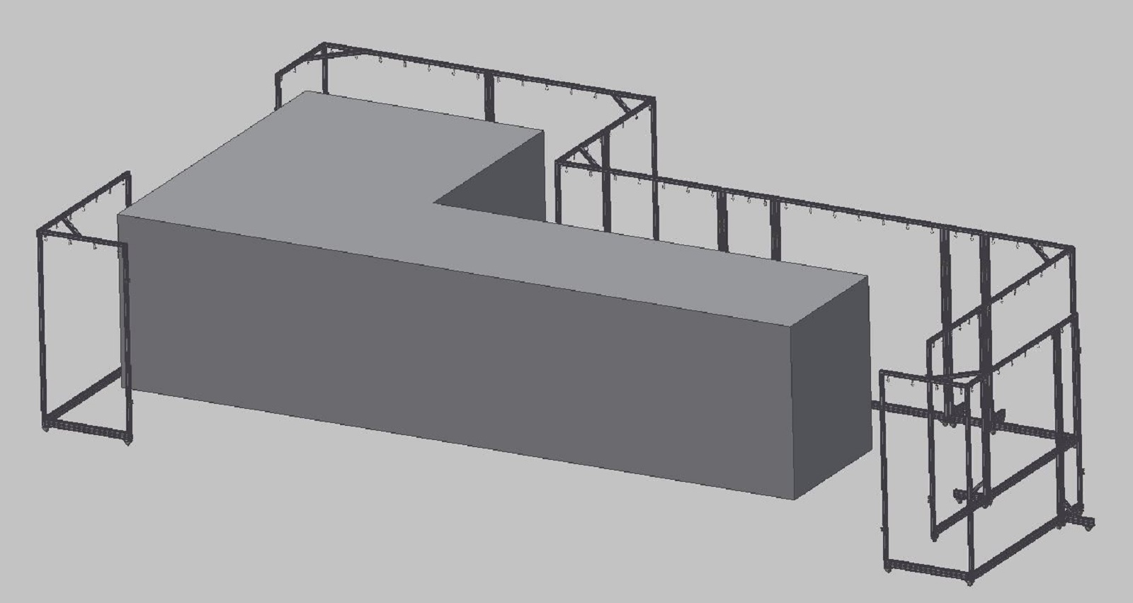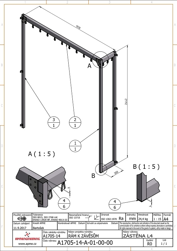 Rámy pro laboratorní zástěnyJedná se jednoduché hliníkové rámy. Rámy jsou navrženy z profilů 40x40 a 40x80 s plnou stěnou. Na horní straně rámů jsou v drážkách kluzné jezdce s ocelovými závěsnými oky pro uchycení závěsů. Povrchová úprava hliníkových profilů rámů je přírodní matné eloxování. Ocelové spojovací díly jsou galvanicky zinkovány. Rám pro zástěnu L4 je vybaven nerezovými kotevními prvky pro uchycení na stěnu a rohy jsou zpevněny ocelovými nerezovými výztuhami. Rám L1 je pro snadnou manipulaci osazen pojezdovými kolečky. Všechny rámy jsou navrženy pro použití v čistých prostorech. |