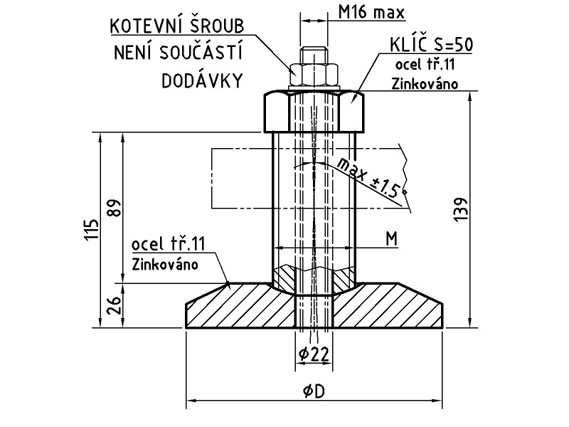 Stavitelné nohy ocelové kotevníStavitelné nohy kotevní KSP jsou nabízeny ve standardních rozměrech M42x3, M48x3 a M56x4 s průměrem talíře 100, 150 a 200mm. V tabulce jsou uvedeny základní rozměry a odkazy ke stažení souborů ve formátu dwg, stp a pdf. Stavitelné nohy jsou nabízeny i v provedení nerezovém. Tyto nohy jsou určeny především k ustavení zařízení, u kterých je požadováno současně i ukotvení k podlaze. Noha se skládá ze dvou samostatných dílů, čepu se závitem a základového talíře. Pro možnost ukotvení je v ose obou dílů připraven průchozí otvor o průměru 22mm. Kotení šroub není součástí dodávky. Doporučený maximální průměr kotevního šroubu je M16mm. V případě použití většího průměru kotevního šroubu není zajištěna možnost naklopení talíře o úhel 1.5°. Případnou poptávku, nebo objednávku nám můžete zaslat na info@apme.cz, nebo zavolat na tel.: +420 604 287 322