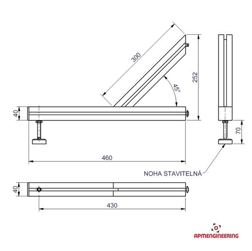 Tato stabilizační příčka délky 460mm je vyrobena z hliníkového eloxovaného profilu, je osazena výškově stavitelnou nohou a slouží k zajištění stability kloubových stěn (Viz. příklady sestavení). Je určena pro stěny, které jsou také vybaveny stavitelnými nohami. Příčky jsou dodávány samostatně a je nutné je uchytit k rámu kloubové stěny.