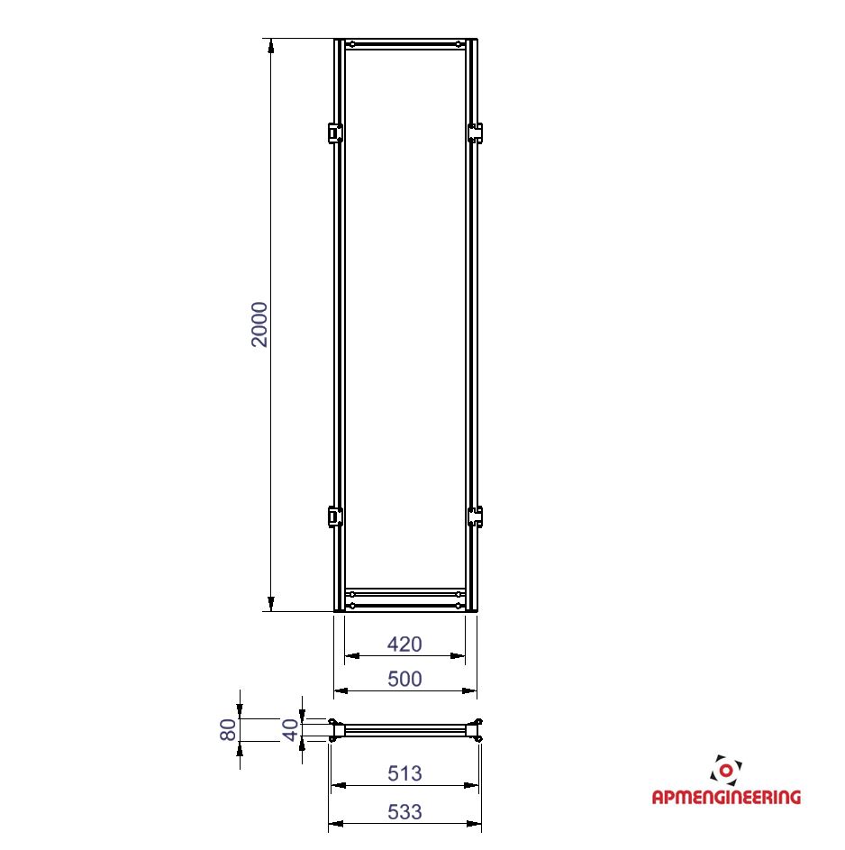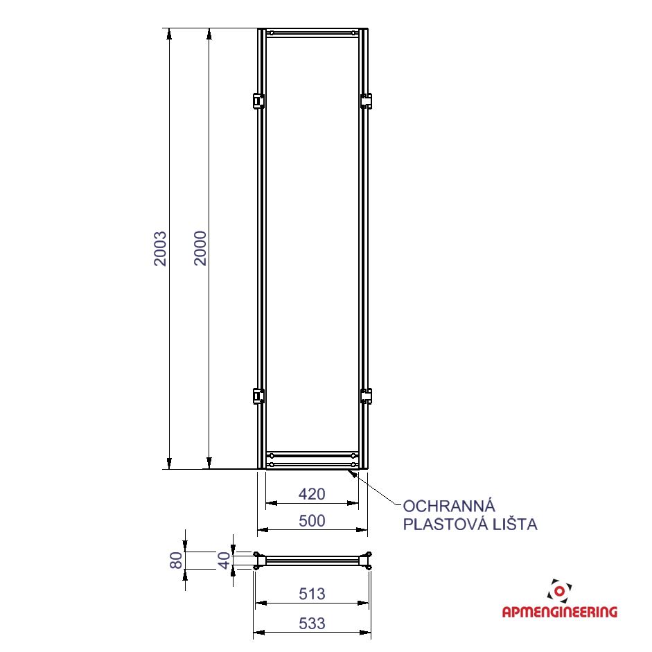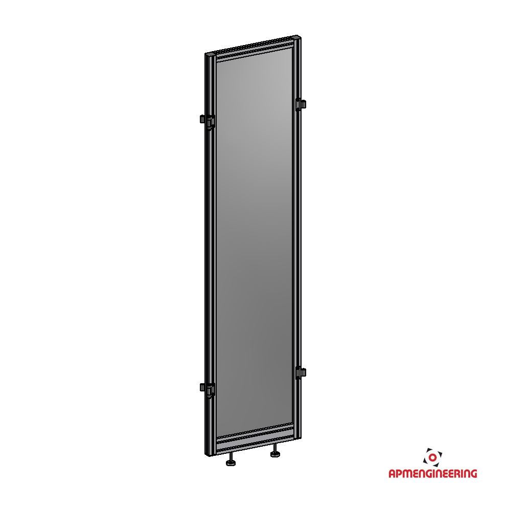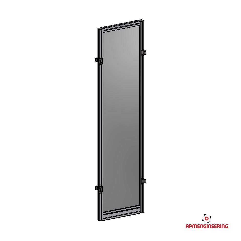 Výška rámu je 2000mm a šíře 500mm. Toto provedení je nutné umístit mezi dva panely s koly, nebo nohami. Je možné ho použít i mezi dva panely s plastovou lištou, kdy bude po sestavení pod rámem mezera cca 4mm. Při použití tří, nebo čtyř stabilizačních příček může být použit i jako samostatně stojící (Viz. příklady sestavení). Výplň je ze sendvičové hliníkové desky tl. 3mm (Al/polyethylen/Al).