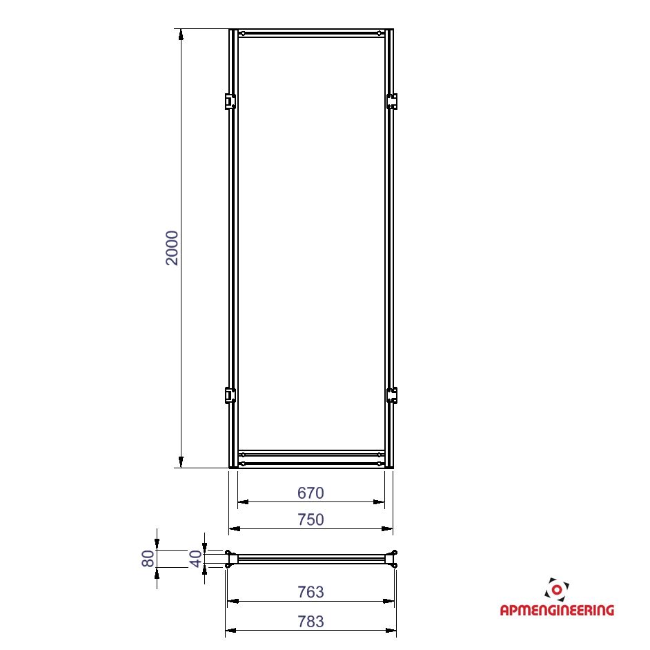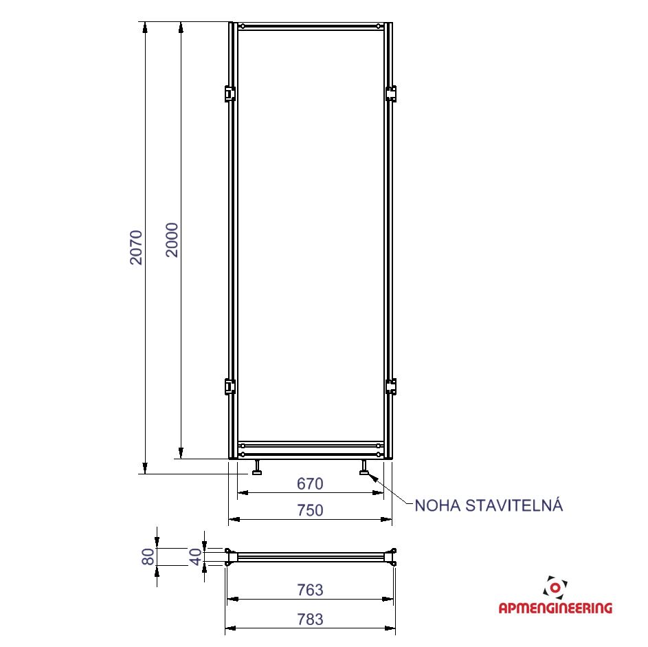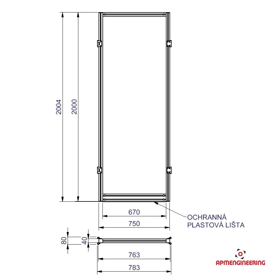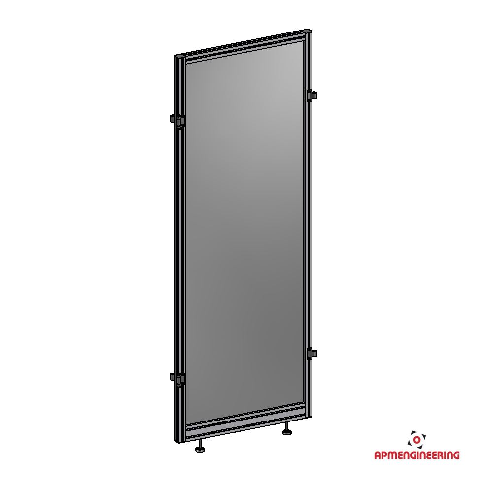 Výška rámu je 2000mm a šíře 750mm. Toto provedení je nutné umístit mezi dva panely s koly, nebo nohami. Je možné ho použít i mezi dva panely s plastovou lištou, kdy bude po sestavení pod rámem mezera cca 4mm. Při použití tří, nebo čtyř stabilizačních příček může být použit i jako samostatně stojící (Viz. příklady sestavení). Výplň je ze sendvičové hliníkové desky tl. 3mm (Al/polyethylen/Al).