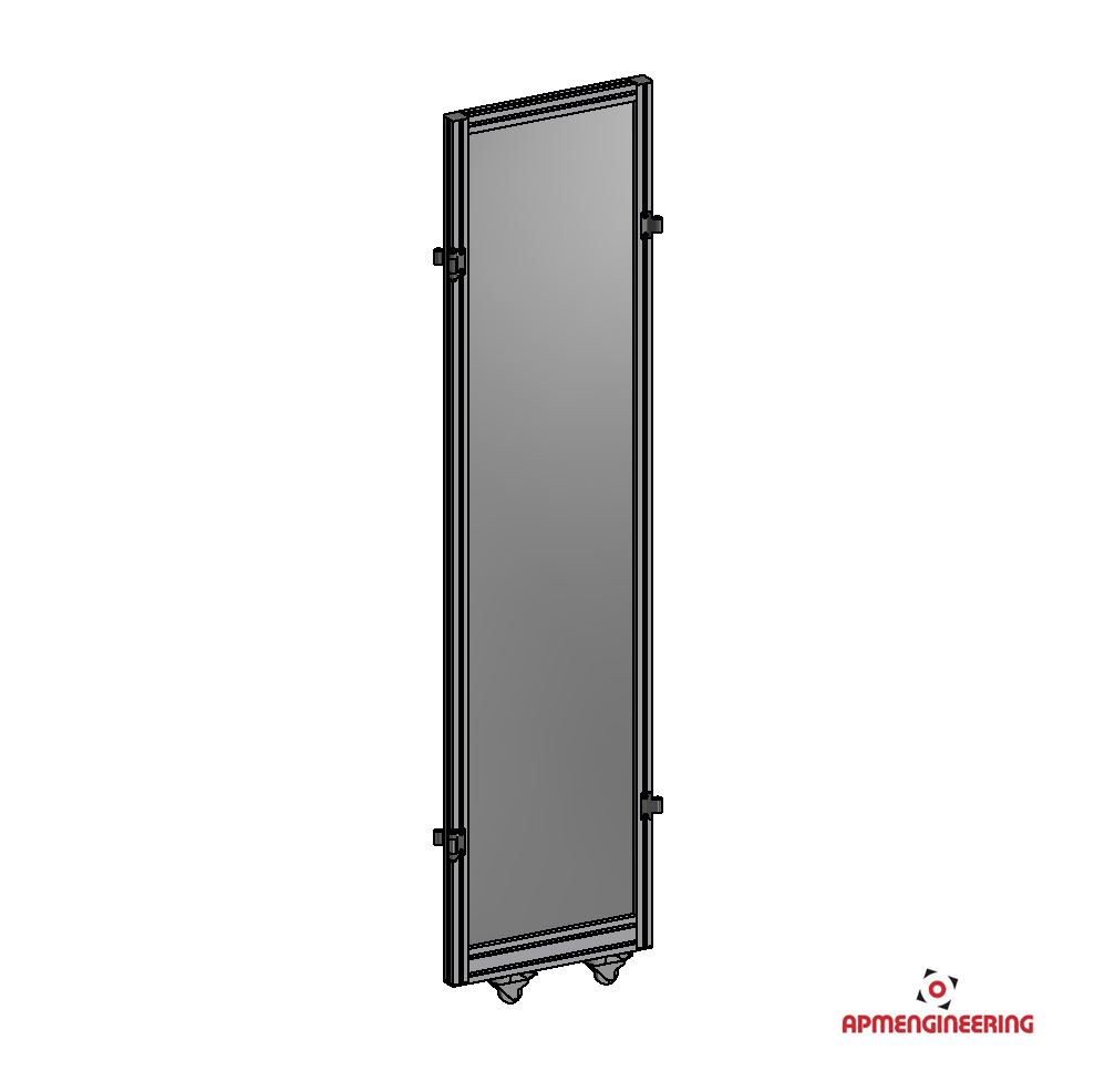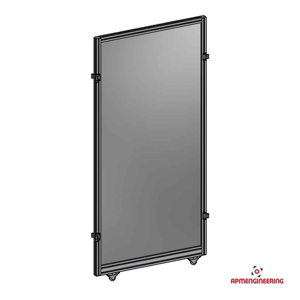 Výška rámu je 2000mm a šíře 1000mm. Rám je osazen dvěmi kolečky s brzdou. Toto provedení je vhodné především pro stěny, kde se předpokládá časté přestavování. Při použití dvou stabilizačních příček STKLPR-K05-Al může být použito i jako samostatně stojící díl (Viz. příklady sestavení). Kolečka zajišťují snadný posun po podlaze. Výplň je ze sendvičové hliníkové desky tl. 3mm (Al/polyethylen/Al). Lze kombinovat se stěnou STKLPR-N s nohami.