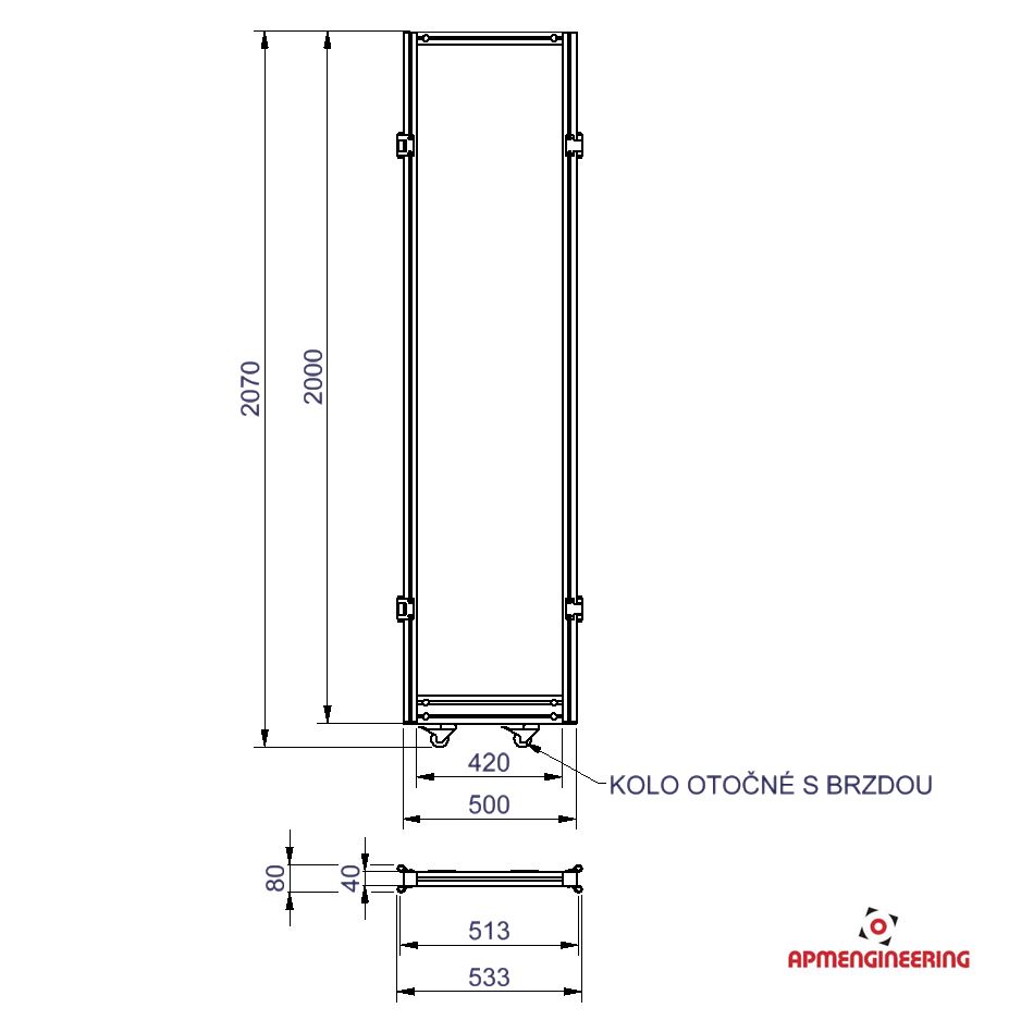 Výška rámu je 2000mm a šíře 500mm. Rám je osazen dvěmi kolečky s brzdou. Toto provedení je vhodné především pro stěny, kde se předpokládá časté přestavování. Při použití dvou stabilizačních příček STKLPR-K05-Al může být použito i jako samostatně stojící (Viz. příklady sestavení). Kolečka zajišťují snadný posun po podlaze. Výplň je ze sendvičové hliníkové desky tl. 3mm (Al/polyethylen/Al). Lze kombinovat se stěnou STKLPR-N s nohami.