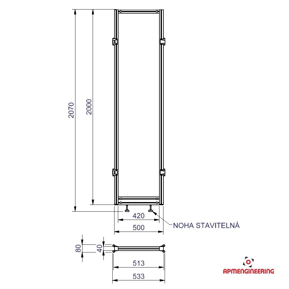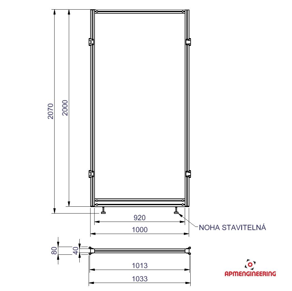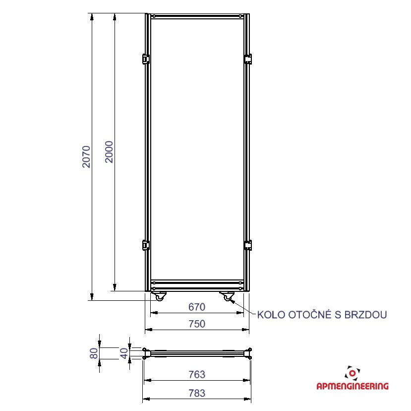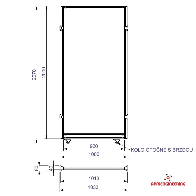 Rámy jsou vyráběny z hliníkových eloxovaných drážkovaných profilů 40x40mm. Standardní rámy mají výšku 2000mm a šířku 500, 750 a 1000mm. Rámy mohou být na spodní straně osazeny kolečky, nohami nebo ochrannou plastovou lištou. Spoje mezi jednotlivými profily jsou provedeny pomocí ocelových zinkovaných PVS spojek. V rámech jsou zasazeny výplně ze sendvičových hliníkových desek (Al/polyethylen/Al). Všechny rámy jsou osazeny oboustranně montovanými panty, které zajišťují spoje mezi jednotlivými panely a po rozpojení jedné, nebo druhé strany i natáčení v rozsahu +/-90°. Rozpojení i spojení pantu je jednoduché, rychlé a lze ho provádět bez použití nářadí. Pro zajištění stability rámů musí být na rámy instalovány stabilizační příčky. Počty a místa umístění příček je nutno volit podle celkové velikost zástěny a také s ohledem na předpokládaný pohyb osob kolem zástěny. V případě potřeby vám rádi připravíme nárh stěny včetně doporučeného rozmístění příček. Pro zajištění stability samostatně stojících stěn je nutné k bokům rámů přichytit minimálně jednu stabilizační příčku na každou stranu rámu. (Viz. příklady sestavení)