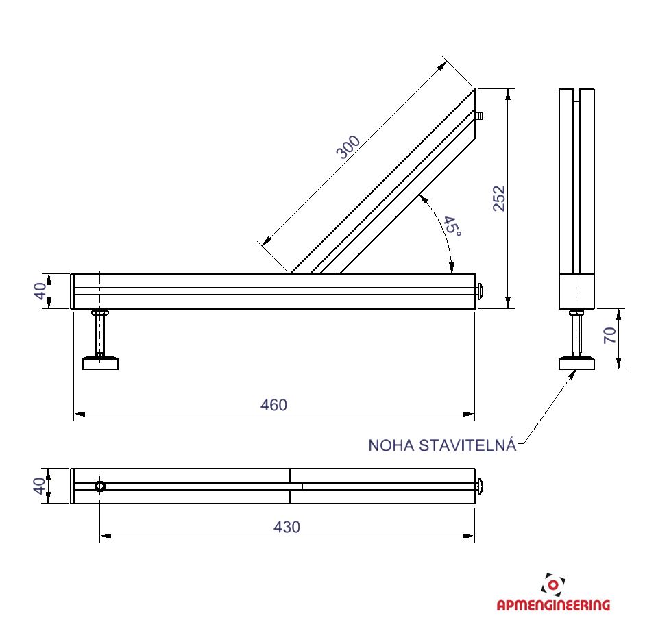 Tato stabilizační příčka délky 460mm je vyrobena z hliníkového eloxovaného profilu, je osazena výškově stavitelnou nohou a slouží k zajištění stability kloubových stěn (Viz. příklady sestavení). Je určena pro stěny, které jsou také vybaveny stavitelnými nohami. Příčky jsou dodávány samostatně a je nutné je uchytit k rámu kloubové stěny.