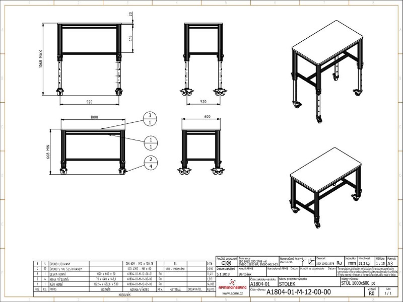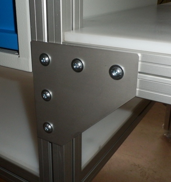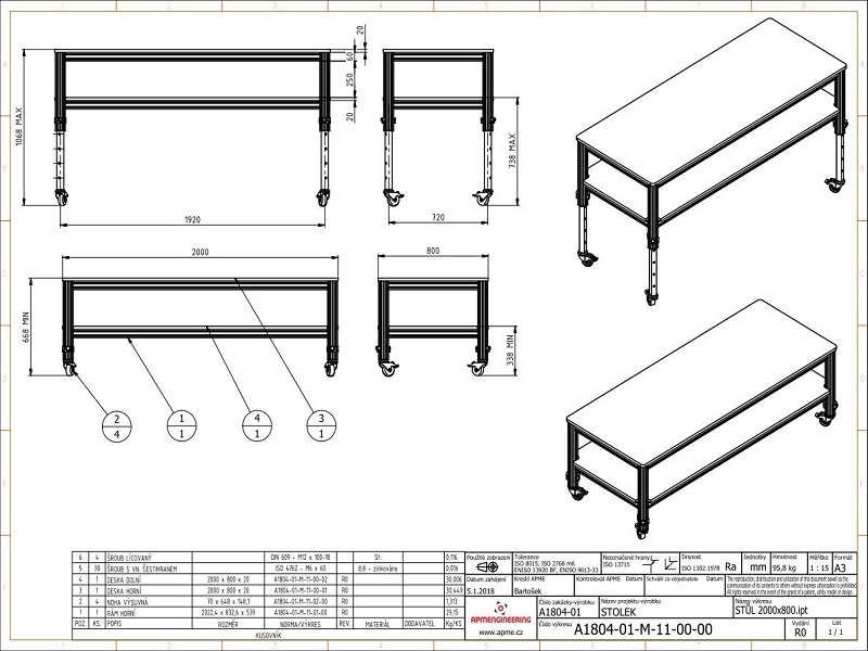 Pracovní stůlStůl je navržen podle požadavků zákazníka na míru. Jedná se o stůl určený do potravinářského provozu. Rám stolu je vyroben z hliníkových profilů 50x50mm s bočními drážkami. Horní pracovní deska tl. 15mm, odkládací police v celé ploše pod pracovní deskou a boční police jsou vyrobeny z bílého materiálu PE-UHMW (Ultravysokomolekulární polyethylen). Tento materiál má dobrou odolnost proti otěru a je vhodný pro použití v potravinářském a zdravotním průmyslu. Všechny desky jsou uchyceny pomocí šroubů a závitových vložek, které zajišťují dostatečně pevné uchycení. Stůl je vybaven také jednou uzamykatelnou zásuvkou v podvěšeném zásuvkovém boxu. Zpevnění uchycení boční police je provedeno pomocí výztuh rámu VPLB-50-VA. Pro ustavení stolu na místě jsou nohy osazeny stavitelnými výkyvnými nohami 50/M16-Al/St. |
