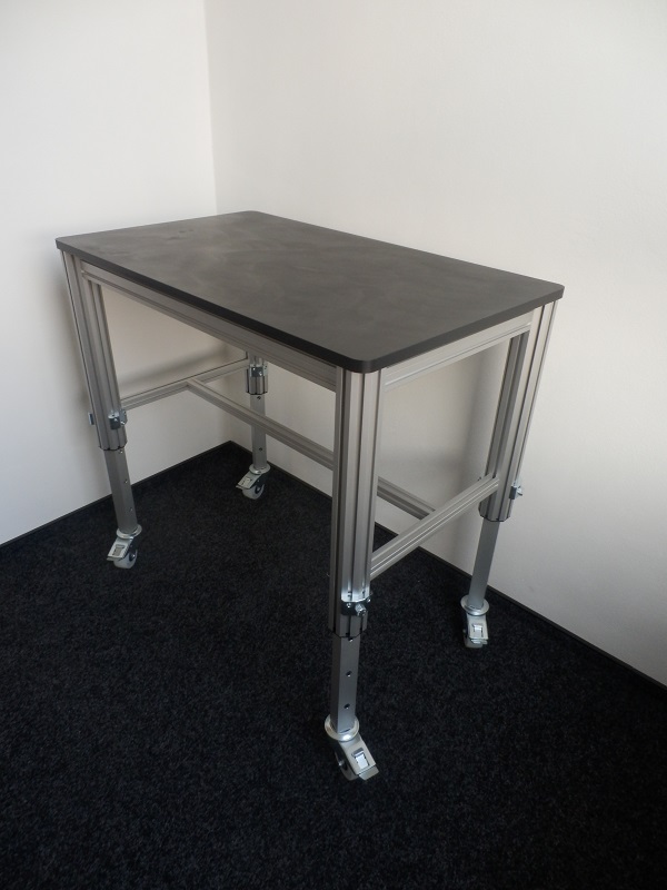 Výškově stavitelné stolyTyto dva stoly byly navrženy podle rozměrových požadavků zákazníka, s požadavkem na chemickou odolnost pracovní desky. Dalším požadavkem byla nosnost jednotlivých stolů 200kg s možností výškového nastavení. Rámy stolů byly vyrobeny z hliníkových profilů 60x30mm a výsuvné nohy byly navrženy z kombinace osmihranného profilu a profilu 40x40mm. Pracovní deska je vyrobena z černého materiálu PEUHMW (Ultravysokomolekulární polyethylen) tl. 20mm. Tento materiál má dobrou odolnost chemickou i odolnost proti otěru a je vhodný pro použití v potravinářském a zdravotním průmyslu. Deska je uchycena pomocí šroubů a závitových vložek, které zajišťují dostatečně pevné uchycení. |