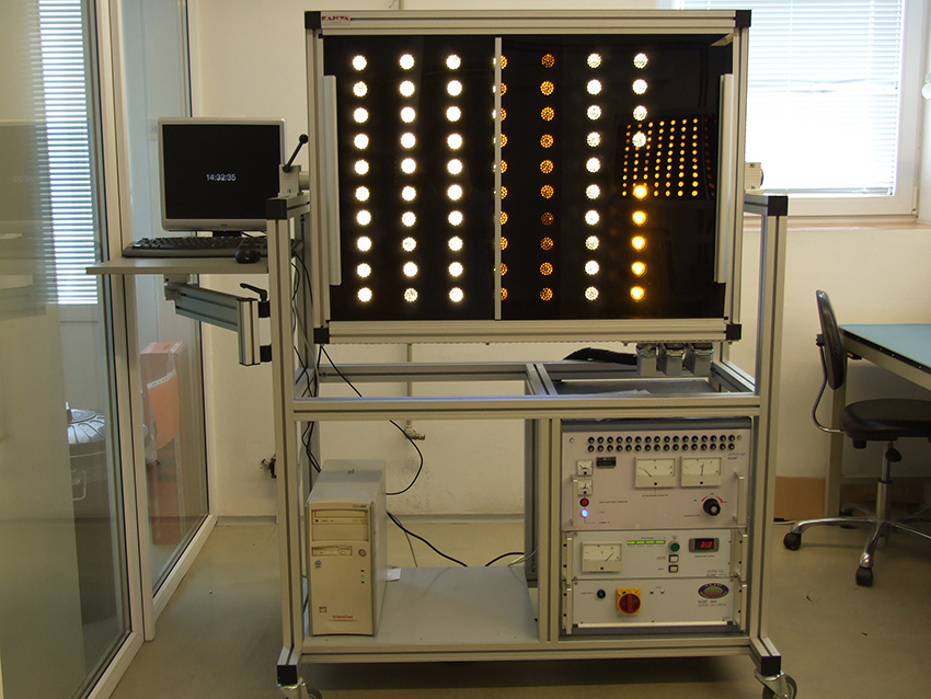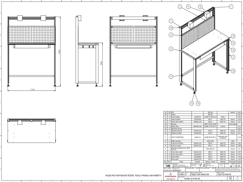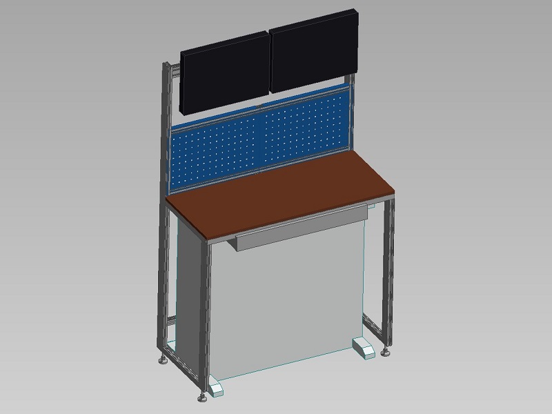 Stůl pro monitoryTento stůl byl navržen jako pracovní místo pro stojící obsluhu. Rám je navržen z hliníkových profilů 60x30 a 30x30. Pracovní plocha je ve výšce cca 1000mm a pod ní je instalována výsuvná zásuvka. Nad pracovní deskou je rám pro instalaci dvou monitorů. Zadní část stolu je vyplněna děrovaným plechem, který umožňuje uchycení dalšího příslušenství. |