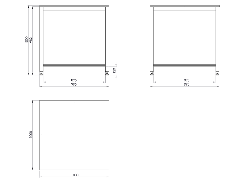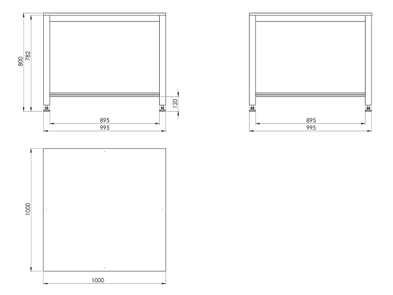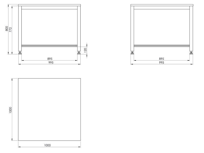 Pracovní stůl o rozměrech desky 1000x1000 mm. Výška stolu je 1000 mm, laminovaná dřevotřísková deska.