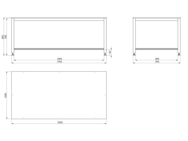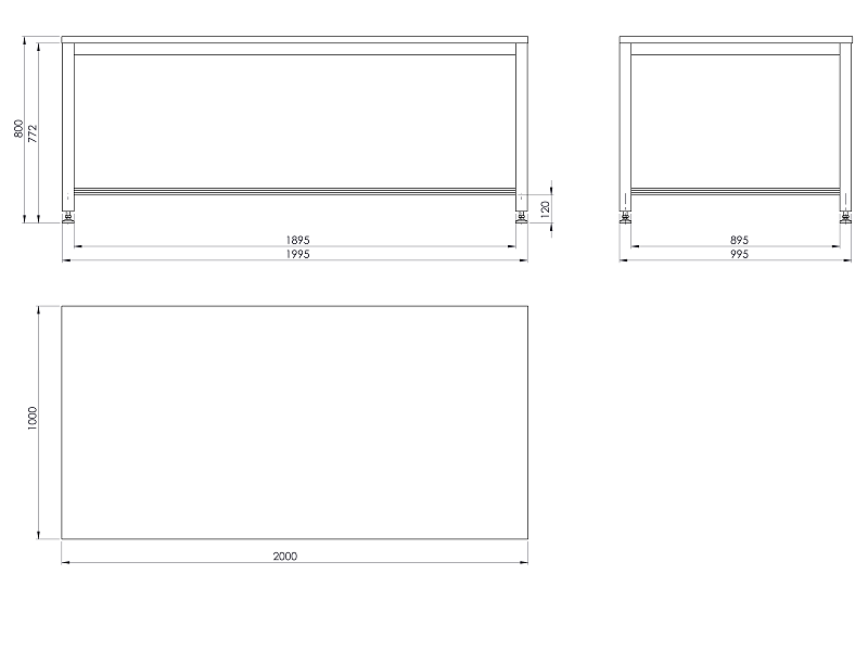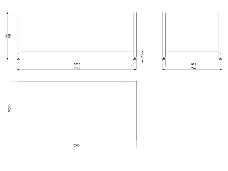 Pracovní stůl o rozměrech desky 1000x2000 mm. Výška stolu je 800 mm, laminovaná dřevotřísková deska.
