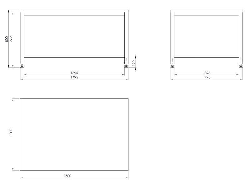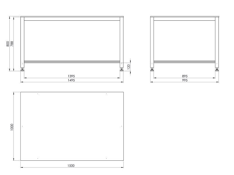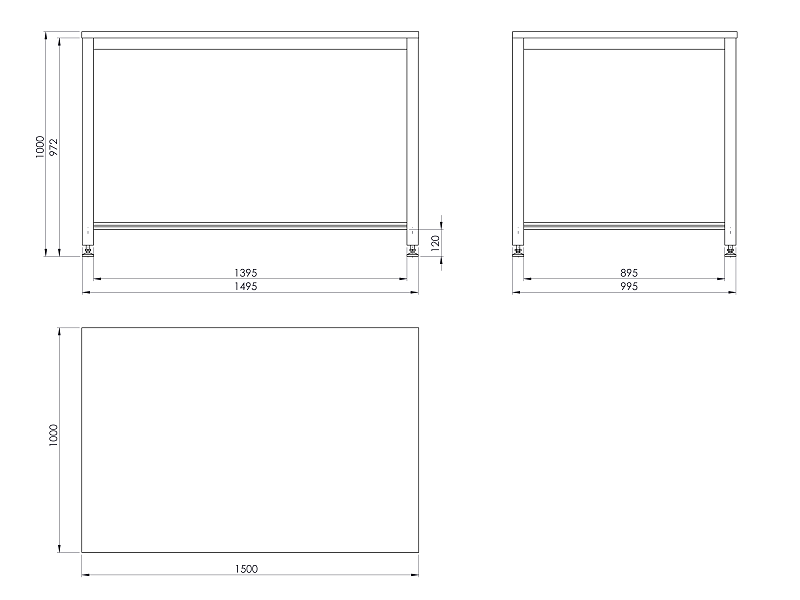 Pracovní stůl o rozměrech desky 1000x1500 mm. Výška stolu je 800 mm, deska z kompozitního laminátu.
