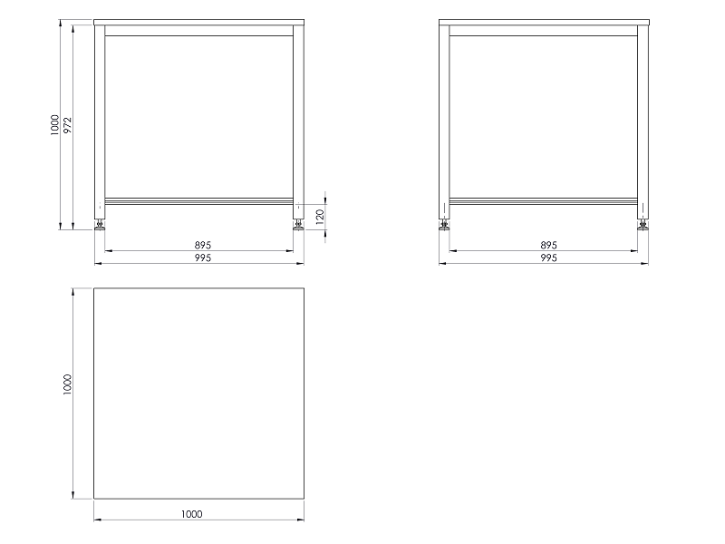 Pracovní stůl o rozměrech desky 1000x1000 mm. Výška stolu je 1000 mm, deska z kopozitního laminátu.