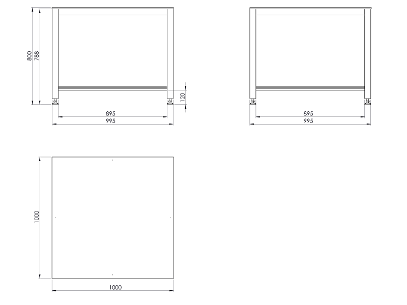 Pracovní stůl o rozměrech desky 1000x1000 mm. Výška stolu je 800 mm, deska z kompozitního laminátu.