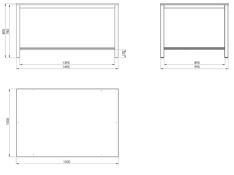 Pracovní stůl o rozměrech desky 1000x1500 mm. Výška stolu je 800 mm, deska z kompozitního laminátu.