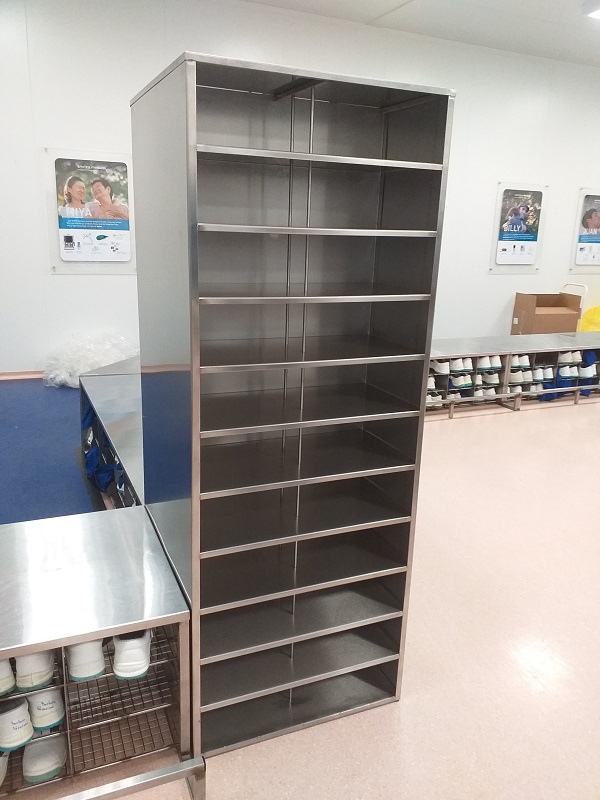 Nerezová skříňOcelová nerezová policová skříň určená do čistých prostor. |